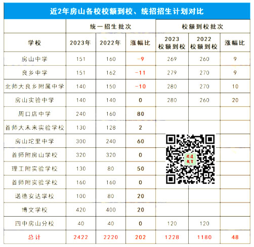 ②2023房山统招批次有13所学校招生2422人,较去年扩招202人,其中6所高中扩招;