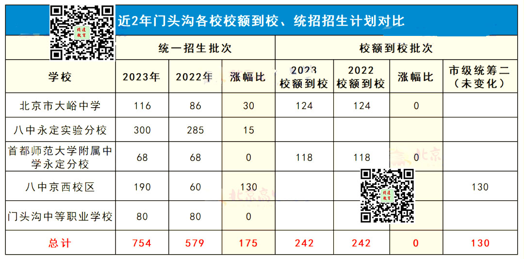 ②2023门头沟统招批次有5所学校共招生754人,较去年扩招175人。其中3所高中扩招;