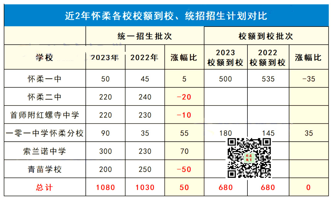 ②2023怀柔统招批次有6所学校招生1080人,较去年扩招50人,其中3所高中扩招;