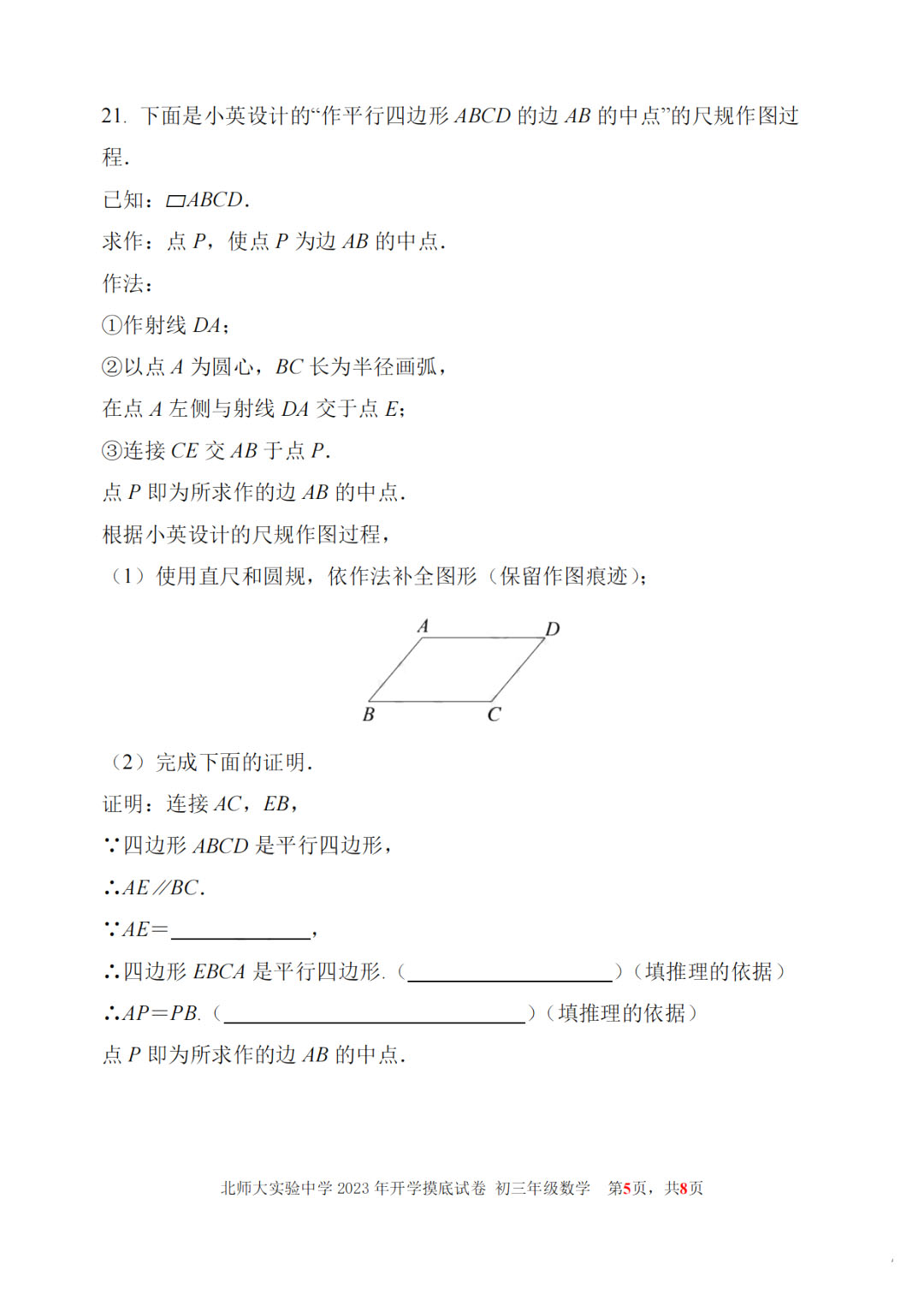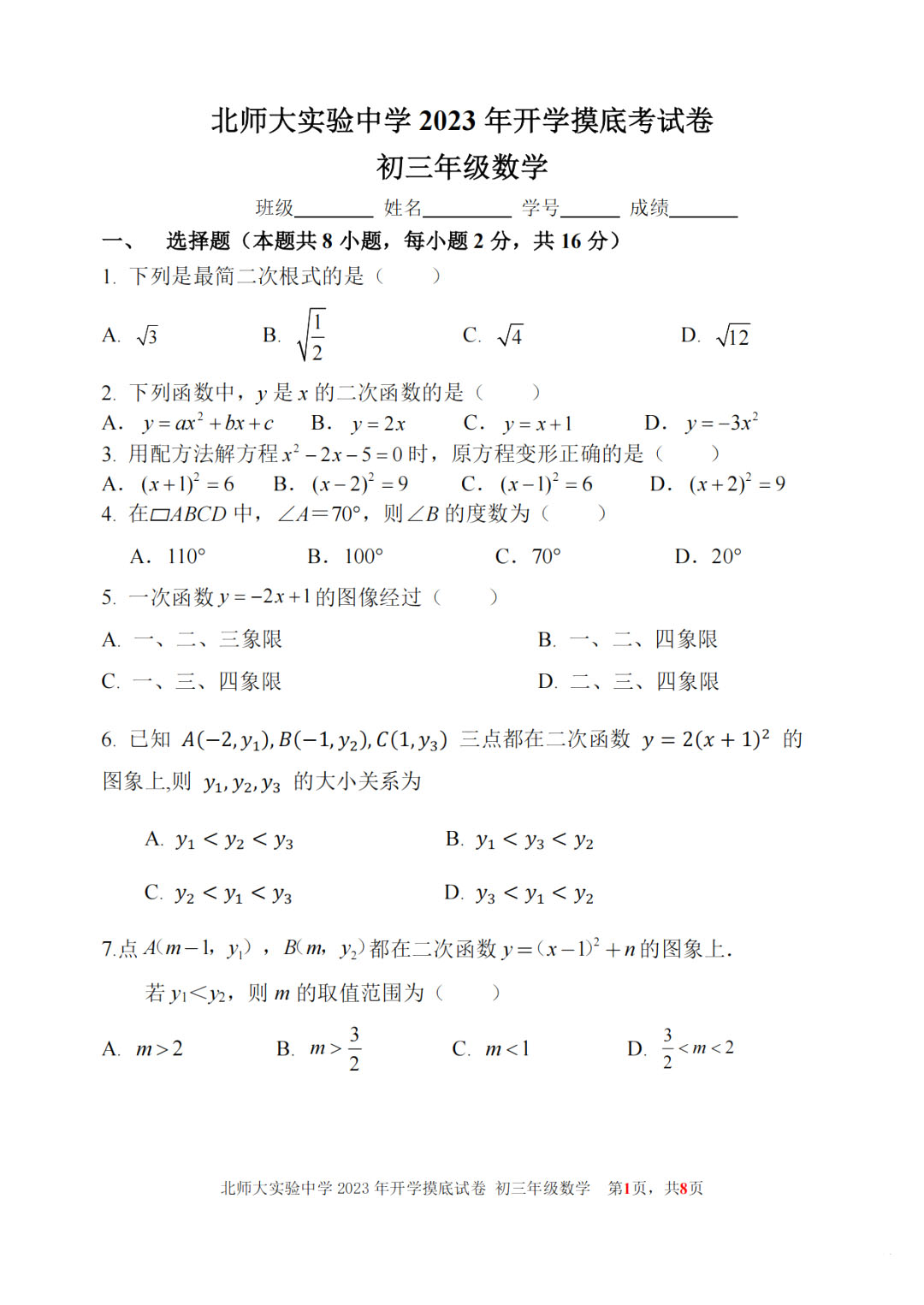 2023-2024学年北师大实验中学初三(上)数学开学测试题及答案已出,admw360中考网为大家整理了内容详情,赶紧下载做起来吧。