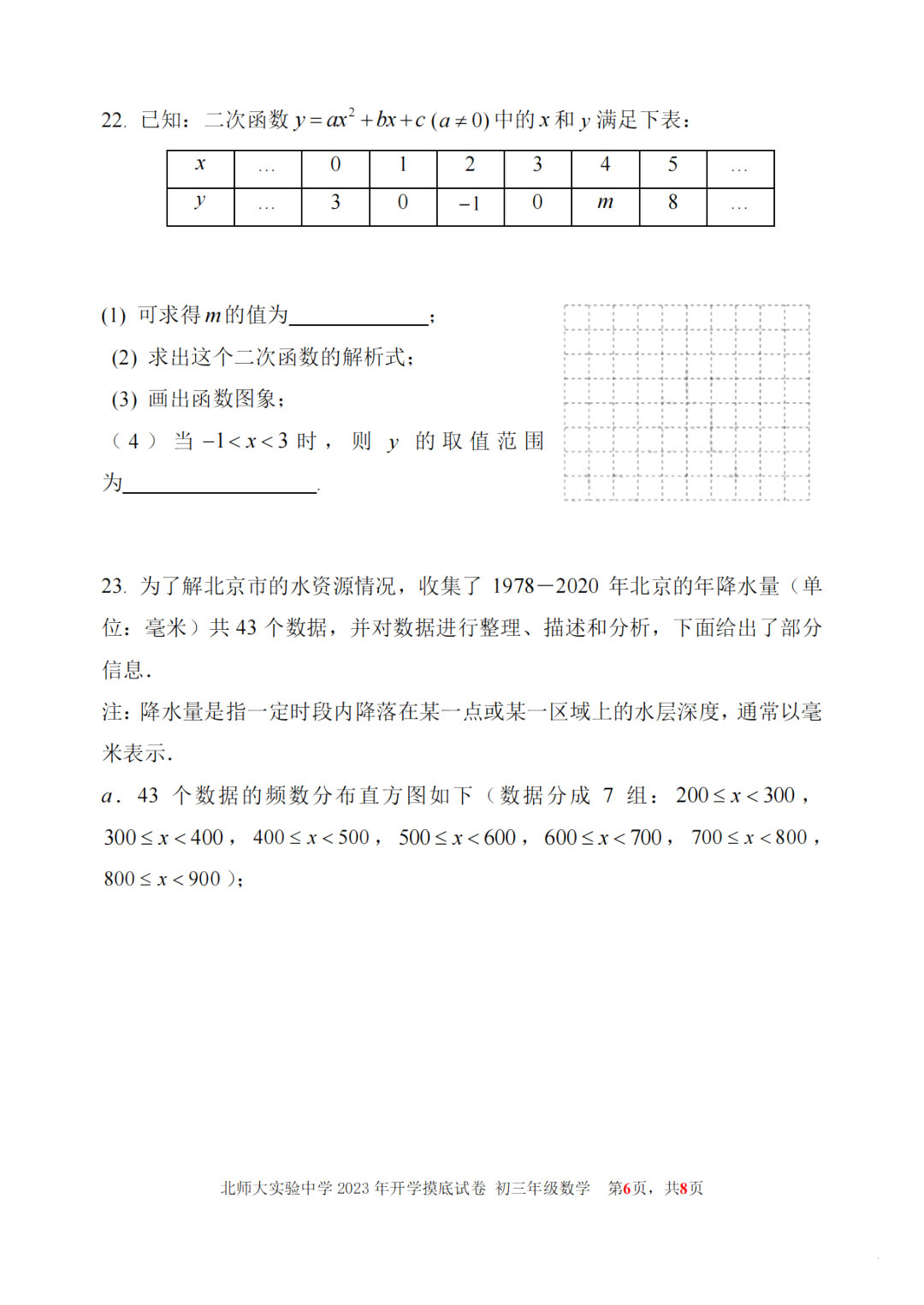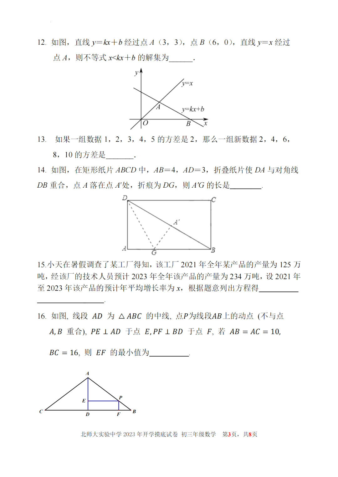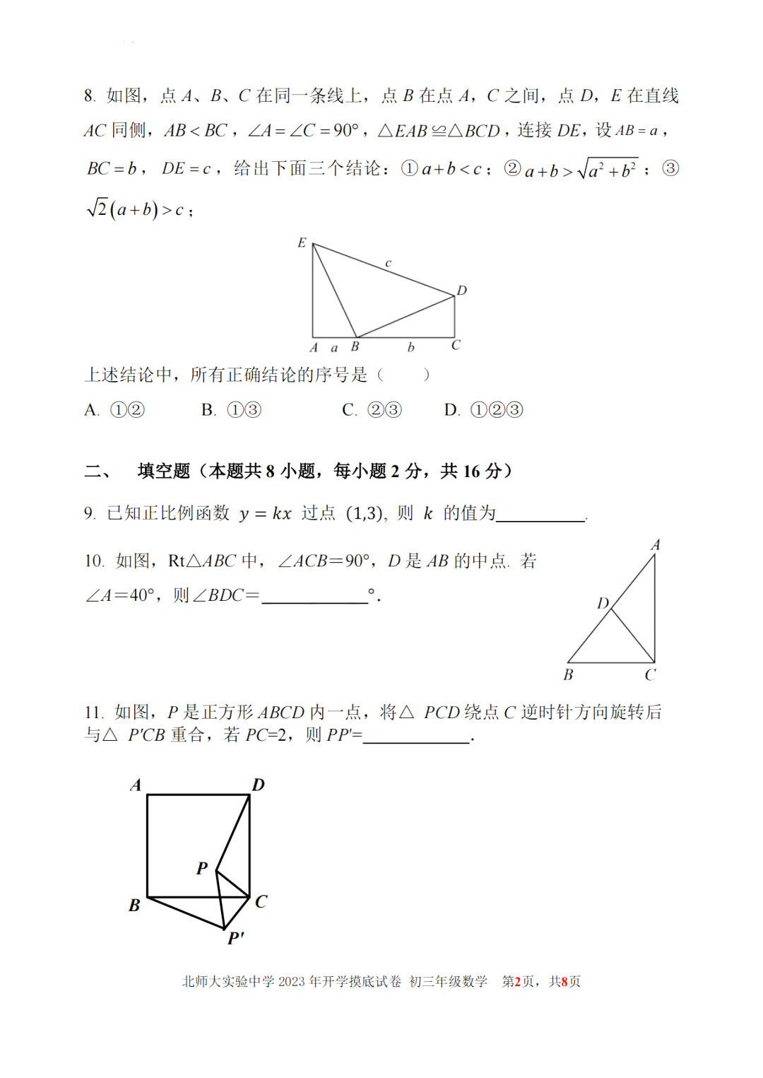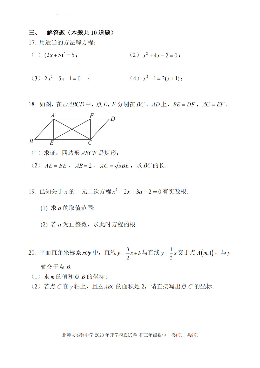 2023-2024学年北师大实验中学初三(上)数学开学测试题及答案