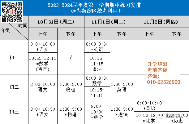 2023-2024海淀初三期中考试时间为:10月31日-11月2日,考试科目为语文、数学、英语、物理、道法、化学、历史;