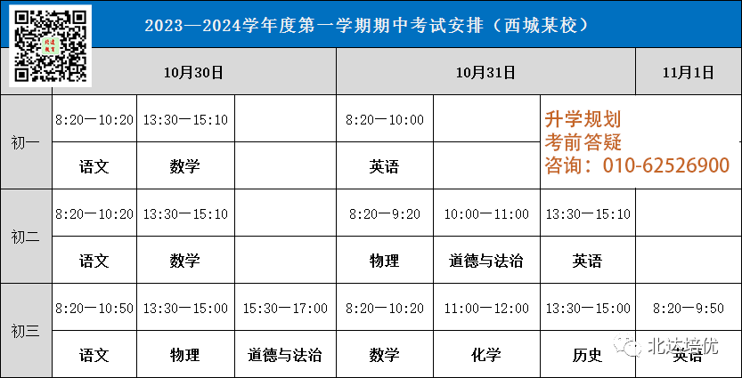 3、2023-2024北京西城初中初一期中考试时间为10月30日-10月31日,考试科目为语文、数学、英语。