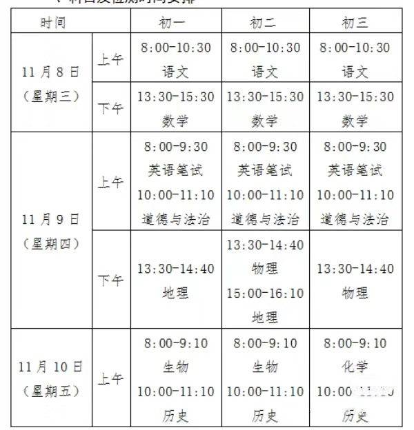 3、2023-2024北京通州初中初一期中考试时间为11月8日-11月10日,考试科目为语文、数学、英语、地理、道德与法治、生物、历史。