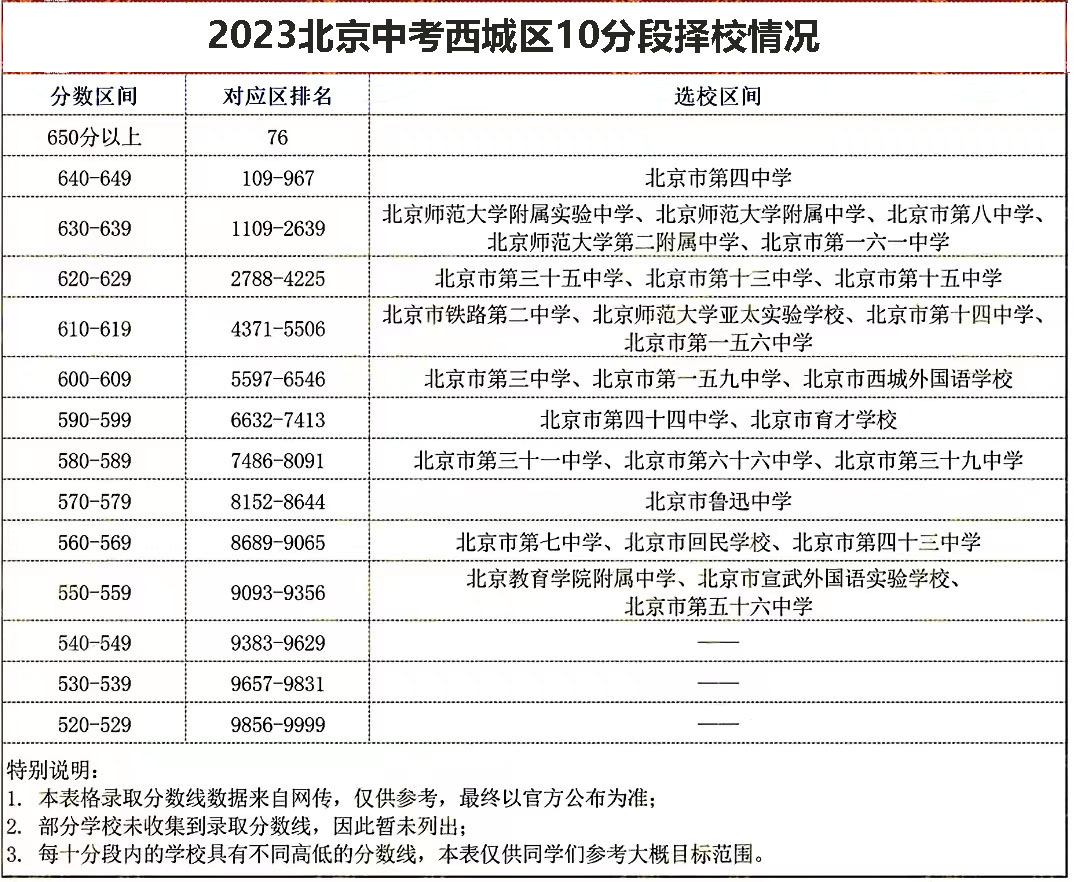 2023年北京西城区初三期中考试已结束,根据目前收集到的数据,2023年西城区录取分数线最高的学校为北京四中643,对应录取位次为571;最低为西城职业学校524,对应录取位次为9957;相比东城,西城区的学校录取分数线就较为均匀了,但可能也有学校数量多的原因在。