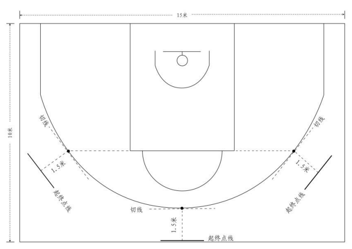 考试用篮球架的篮圈高度为 3.05 米;6 号篮球,球内气压符合篮球竞赛规则要求。考场统一提供符合国家标准的用球,考生不能自带球。考试场地设置在标准篮球场(28 米×15 米)的半场内,在三分线的弧顶点、罚球线延长线与三分线的交点分别画三分线的切线,在三分线外与切线相距 1.5 米处设置起终点线,共设 3 个(0.05 米×2 米)。场地设置如图所示:
