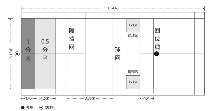 考试场地设置在室内,地面材质为木质地板或羽毛球场地地胶,长13.4 米、宽 5.18 米(单打场宽)。中央网高 1.524 米、边线网高 1.55 米;距离球网 3.35 米处,设置高 2.5 米、宽 6.1 米的隔挡网。考生对面半场内,按照要求明确标示 0.5 分区和 1 分区。