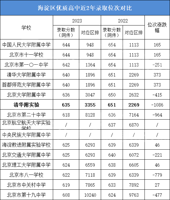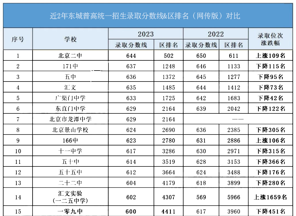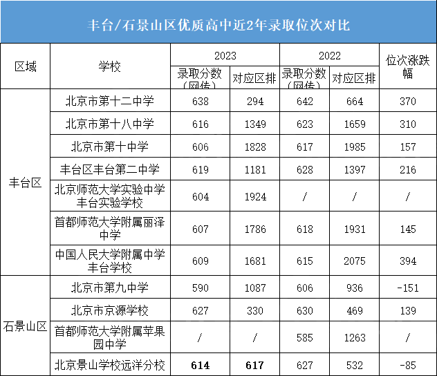 02.以上近2年录取分数为网传版,最终以官方发布为准。从网传版近2年录取位次涨跌幅来看,丰台区和石景山区的的优秀高中各有1所学校有小幅度下跌。