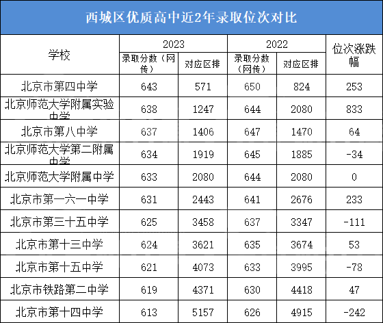 02.以上近2年录取分数为网传版,最终以官方发布为准。从近2年西城区的优质高中网传版的录取位次来看,4所学校录取位次有小幅度的下跌。北师大二附中近2年的录取位次没有发生变化,详细涨跌幅情况如上图所示。