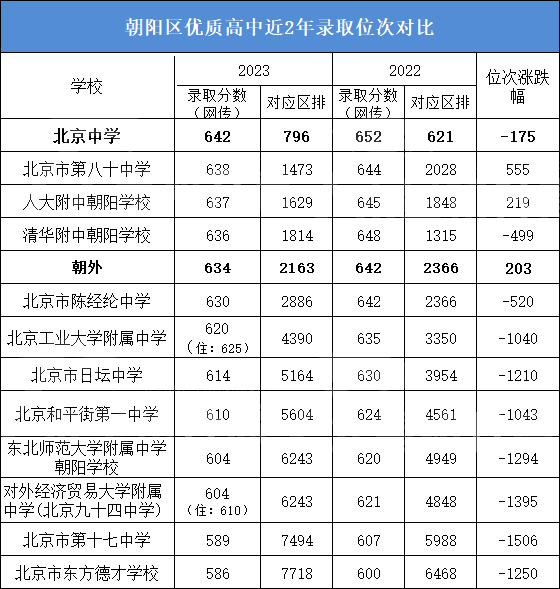 02.以上近2年录取分数为网传版,最终以官方发布为准。从网传版近2年录取位次涨跌幅来看,有八十中 、人朝、朝外3所学校录取位次有一定上升。