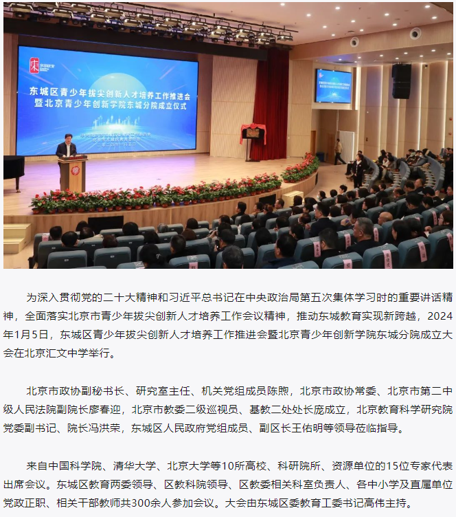 2024年1月5日,东城区青少年拔尖创新人才培养工作推进会暨北京青少年创新学院东城分院成立大会在北京汇文中学举行。