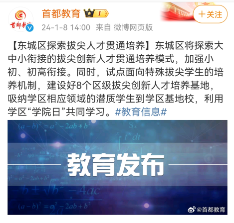这次东城区将探索大中小衔接的拔尖创新人才贯通培养模式,加强小初、初高衔接,形成拔尖创新人才早期培育的合力。相信会为东城区的人才培养增添更有力的措施。