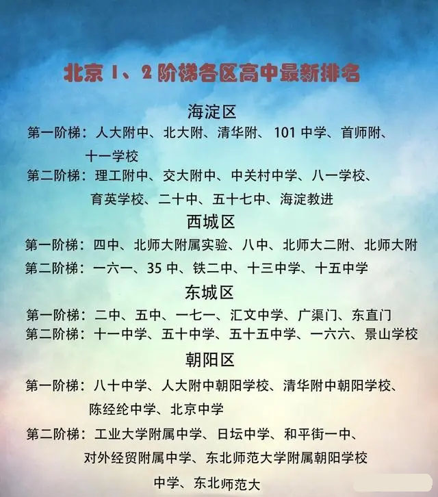 朝阳区的高中排名同样备受关注,八十中学、人大附中朝阳学校等学校在第一阶梯,工业大学附中、日坛中学等学校在第二阶梯。