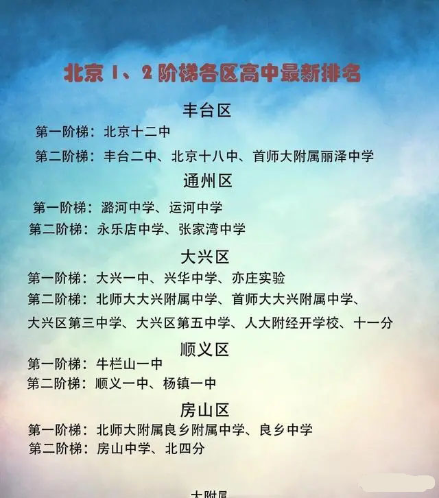 海淀区的高中排名一直备受关注,第一阶梯的知名学校有人大附中、北大附中等,而第二阶梯包括理工附中、交大附中等学校。