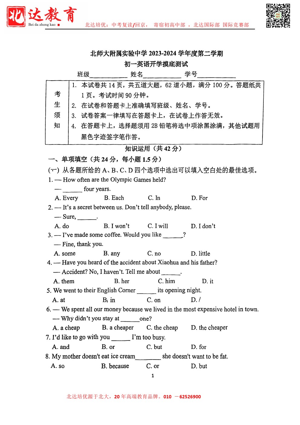 admw360中考网最新整理了2024北京师范大学附属中学七(下)英语开学摸底测试题,需要的同学赶紧下载练习吧!