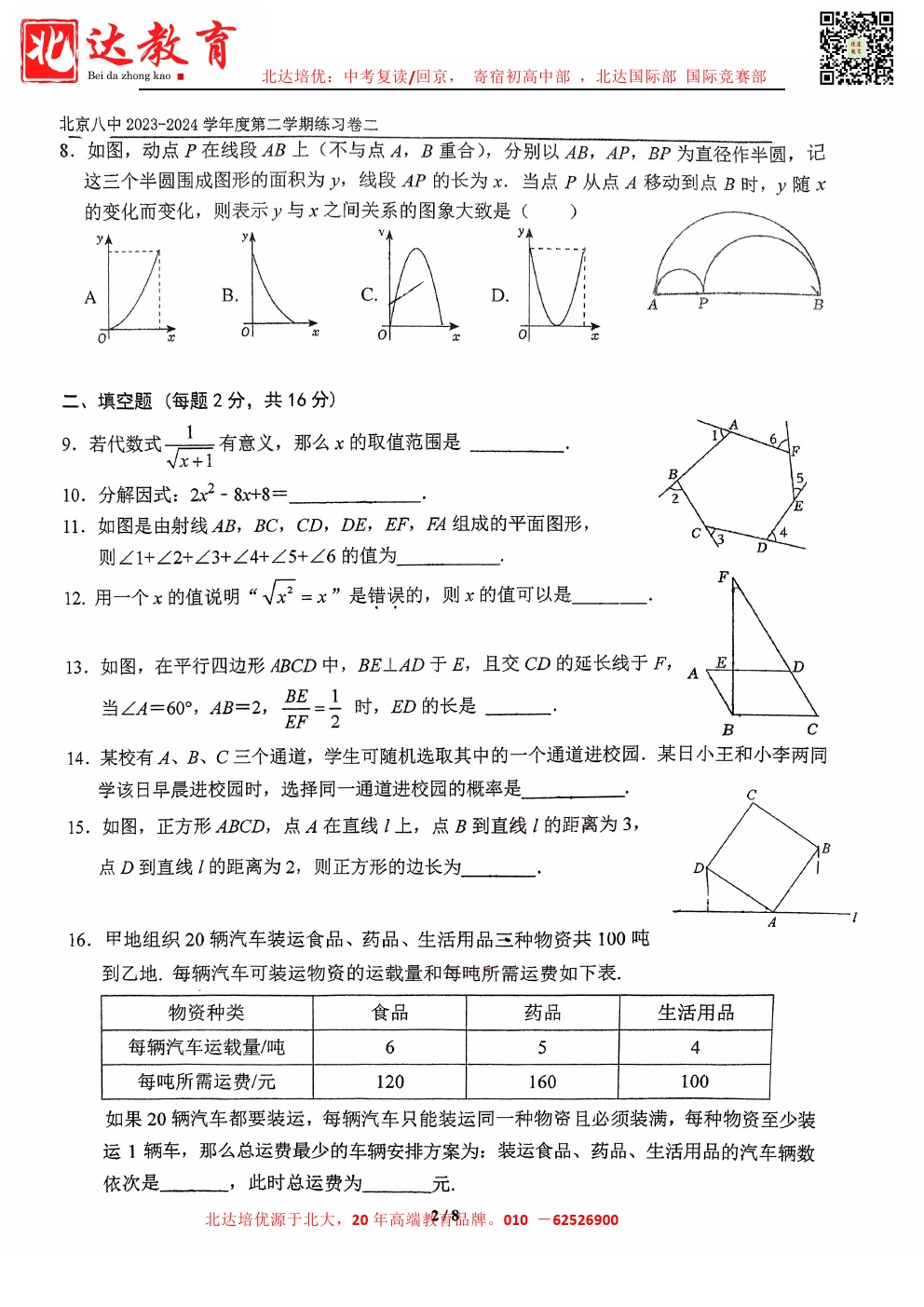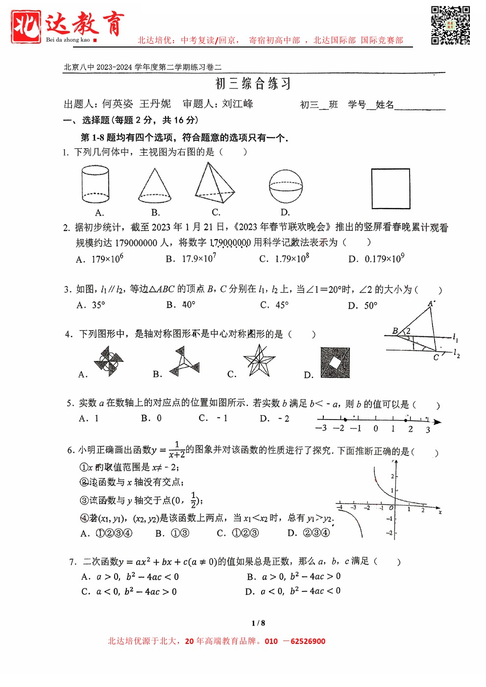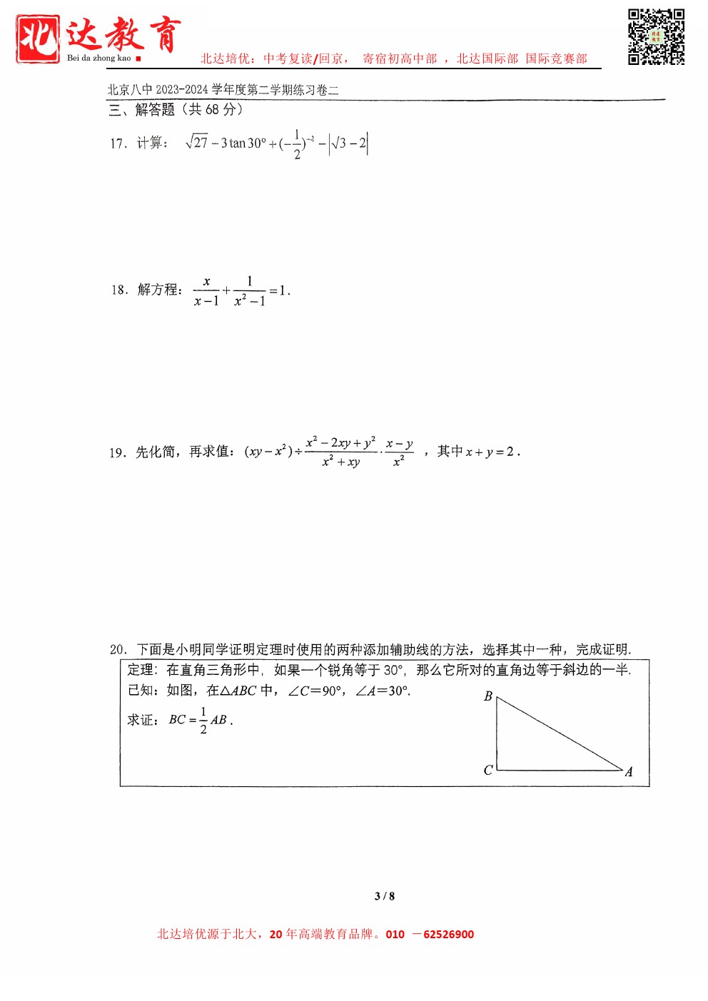 admw360中考网最新整理了2024北京八中初三(下)3月月考数学试题,需要的同学赶紧下载练习吧!