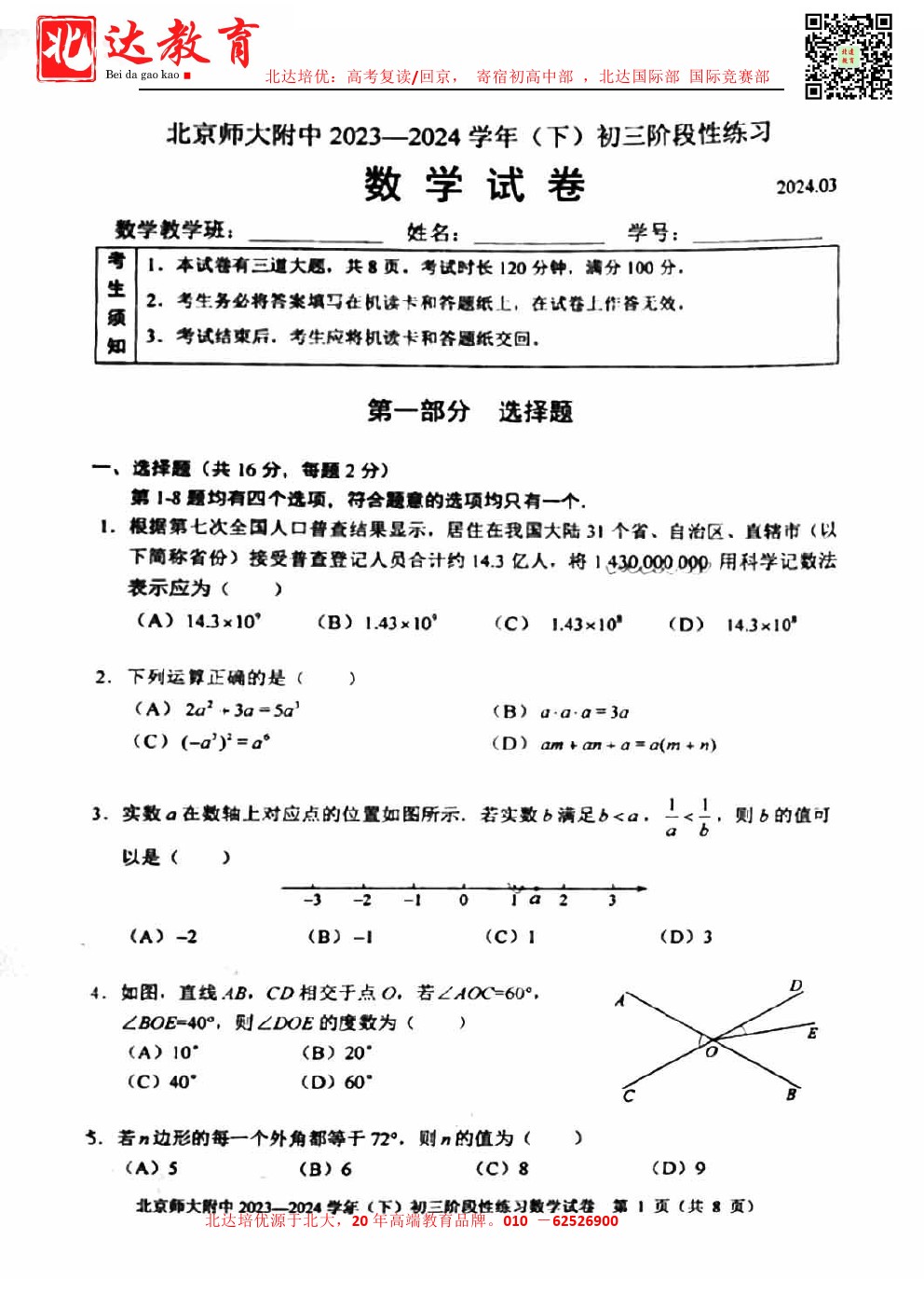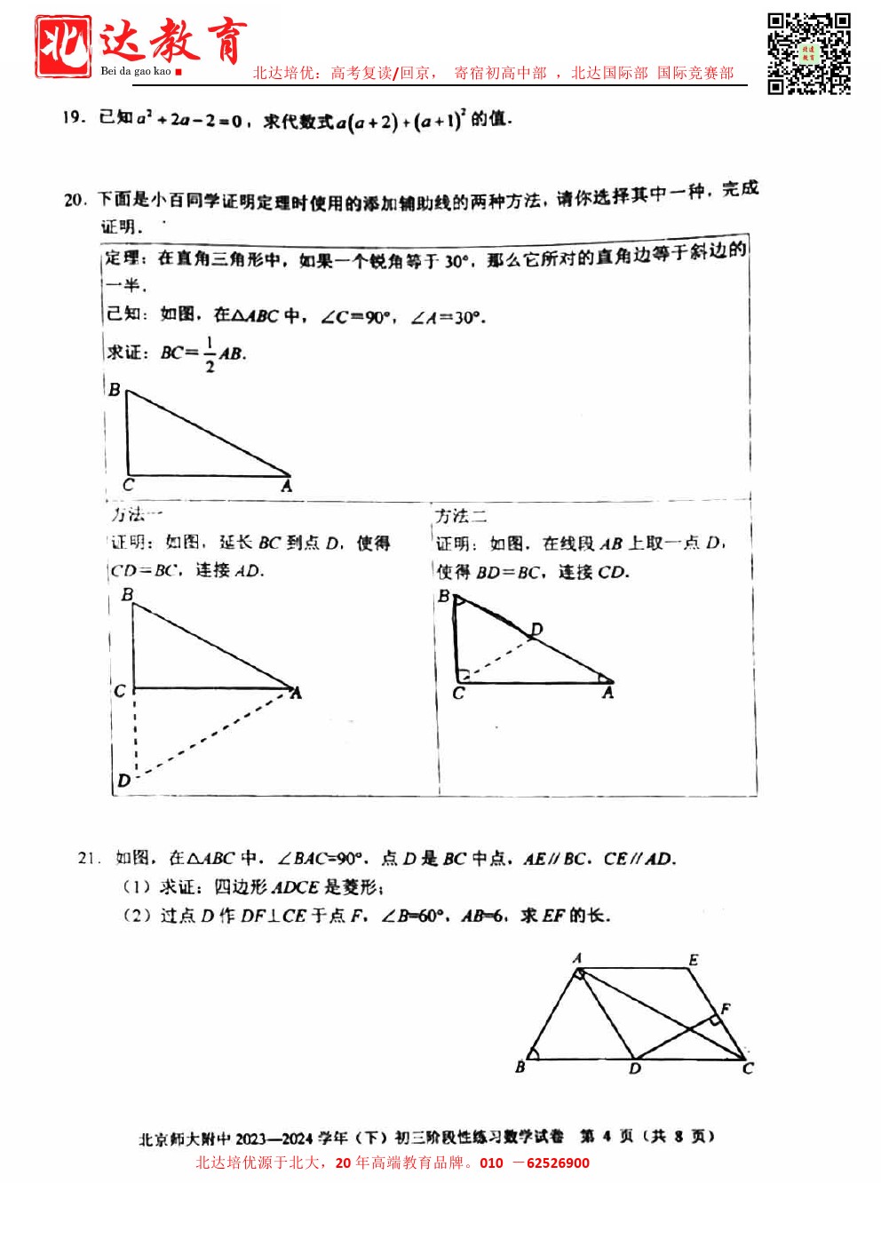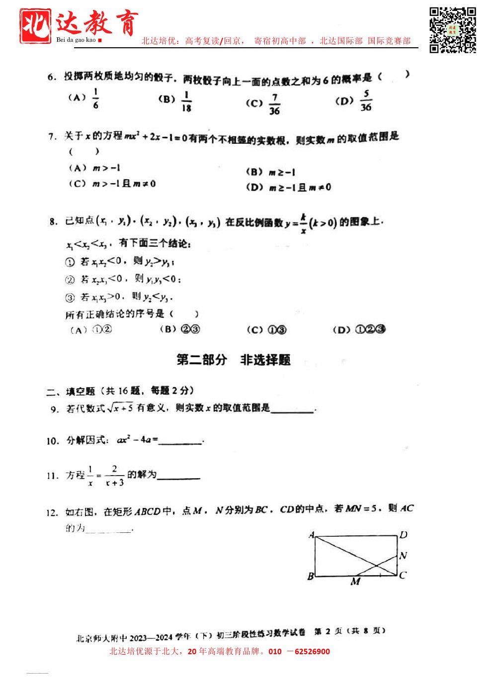 admw360中考网最新整理了2024北京师大附中初三(下)3月月考数学试题,需要的同学赶紧下载练习吧! 北京admw360全日制学校,中高考复读,外地回京中高考 电话咨询:400-6168182 0…