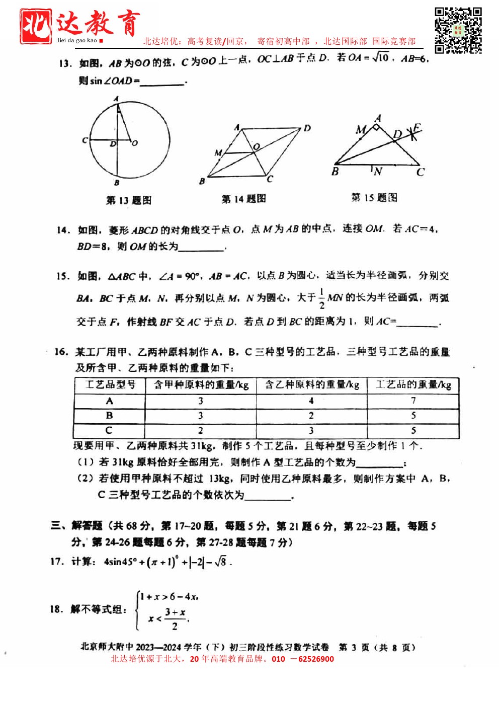 admw360中考网最新整理了2024北京师大附中初三(下)3月月考数学试题,需要的同学赶紧下载练习吧!