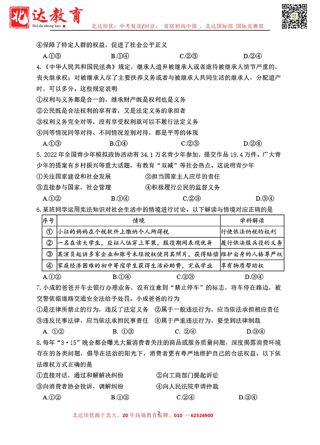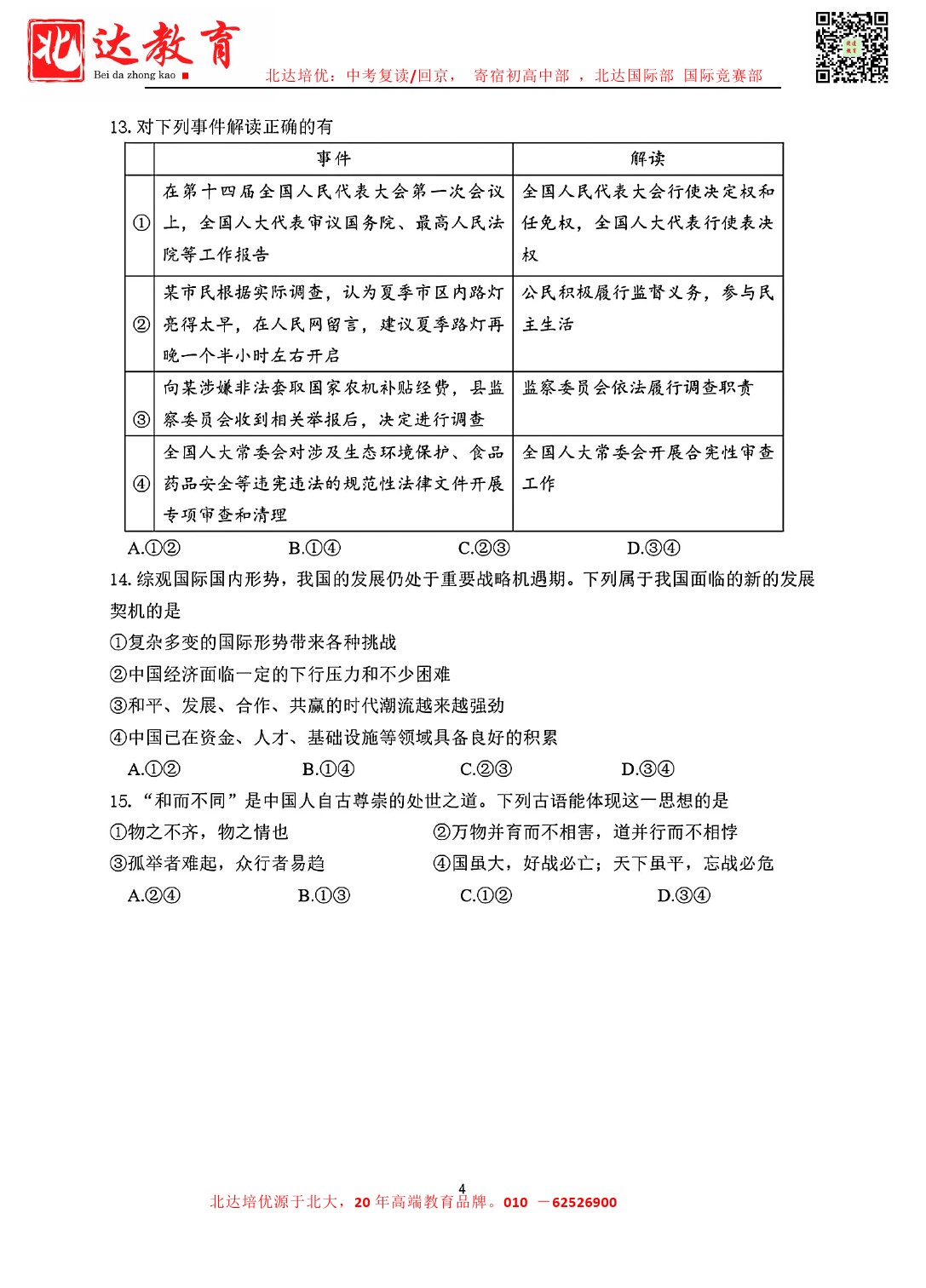 admw360中考网最新整理了2024北京四中初三(下)3月月考道法试题,需要的同学赶紧下载练习吧! 北京admw360全日制学校,中高考复读,外地回京中高考 电话咨询:400-6168182 010…