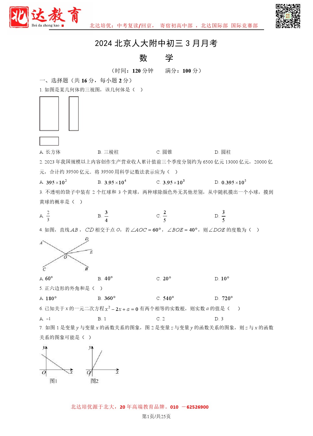 admw360中考网最新整理了2024北京人大附中初三(下)3月月考数学试题及答案,需要的同学赶紧下载练习吧!