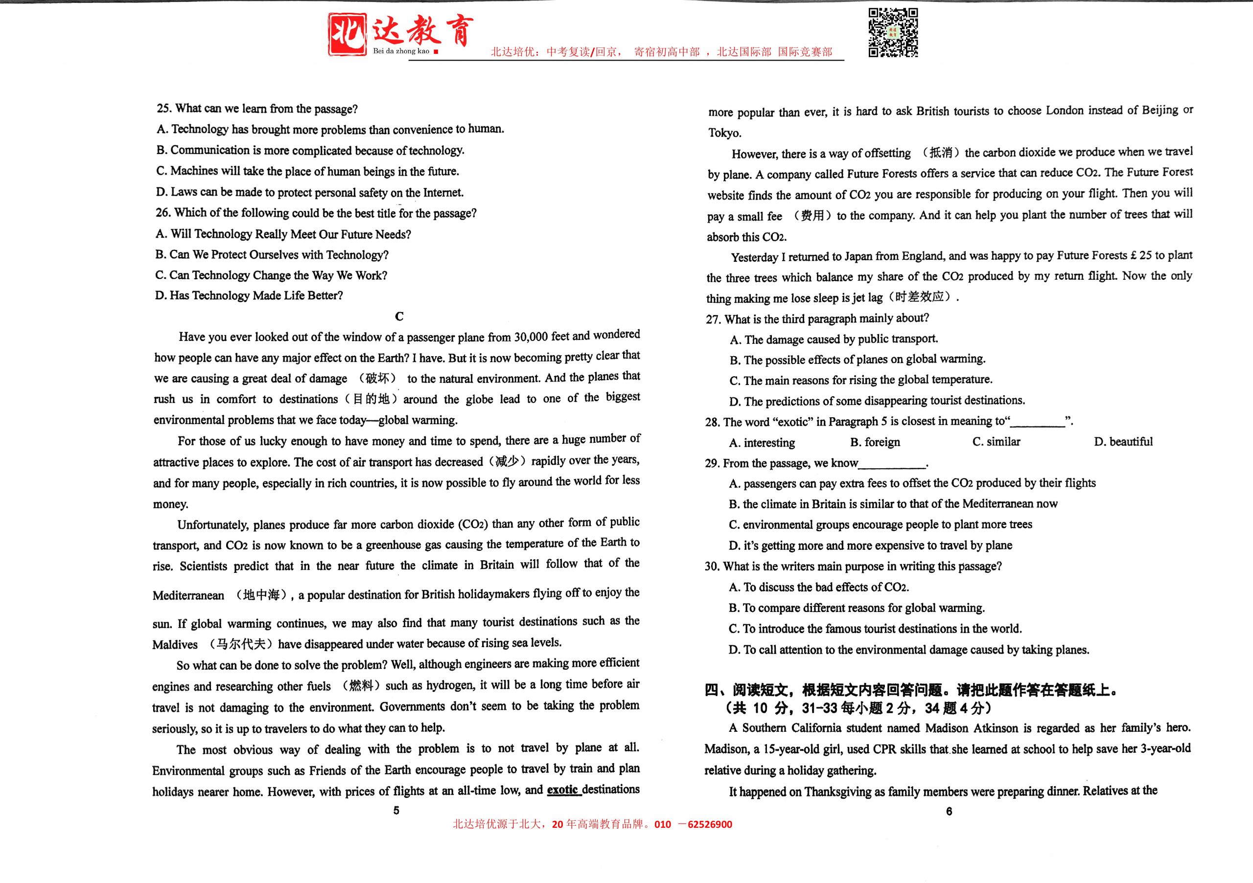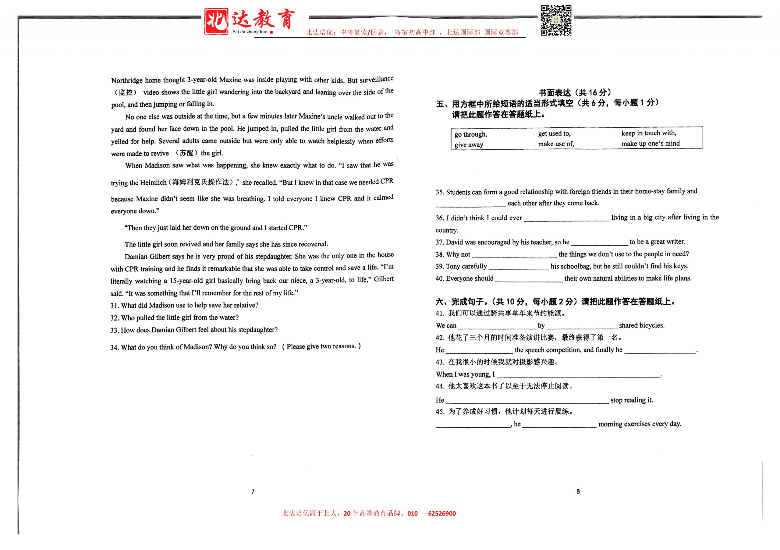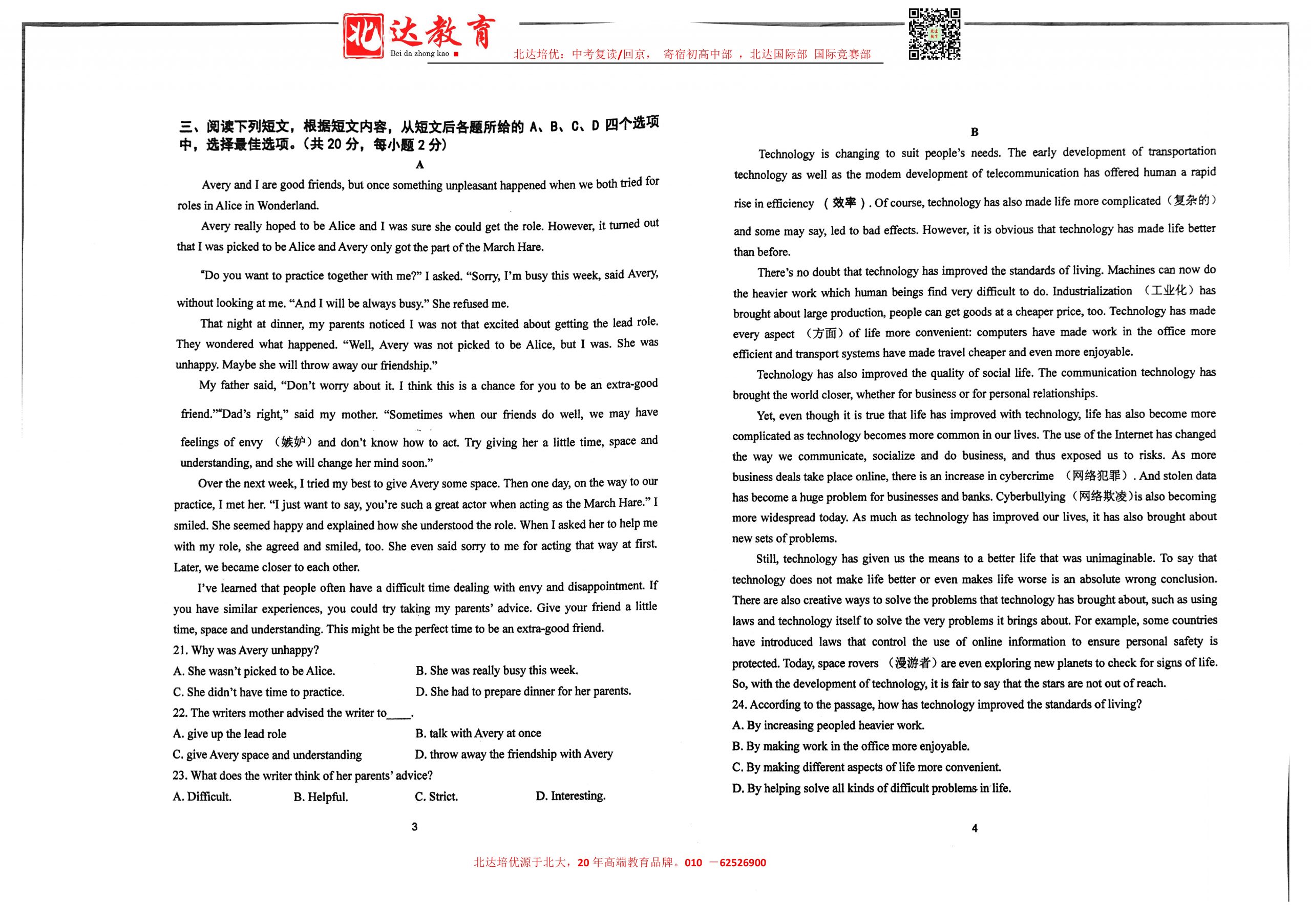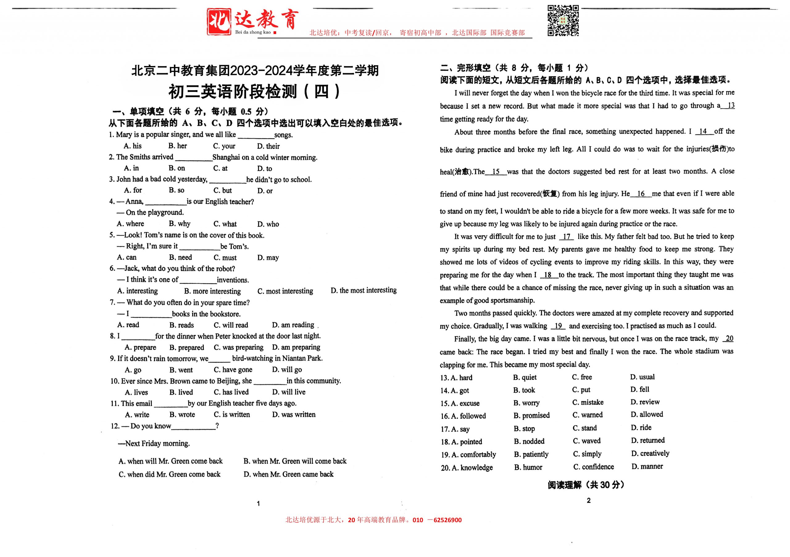 admw360中考网最新整理了2024北京二中教育集团初三(下)阶段检测四英语试题,需要的同学赶紧下载练习吧! 北京admw360全日制学校,中高考复读,外地回京中高考 电话咨询:400-616818…