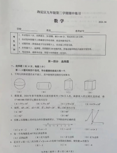 首页 初三试题 北京海淀2024初三一模考数学试卷及答案