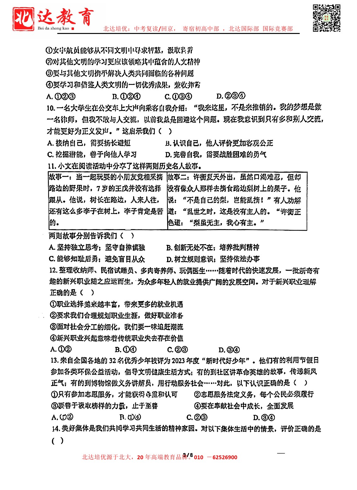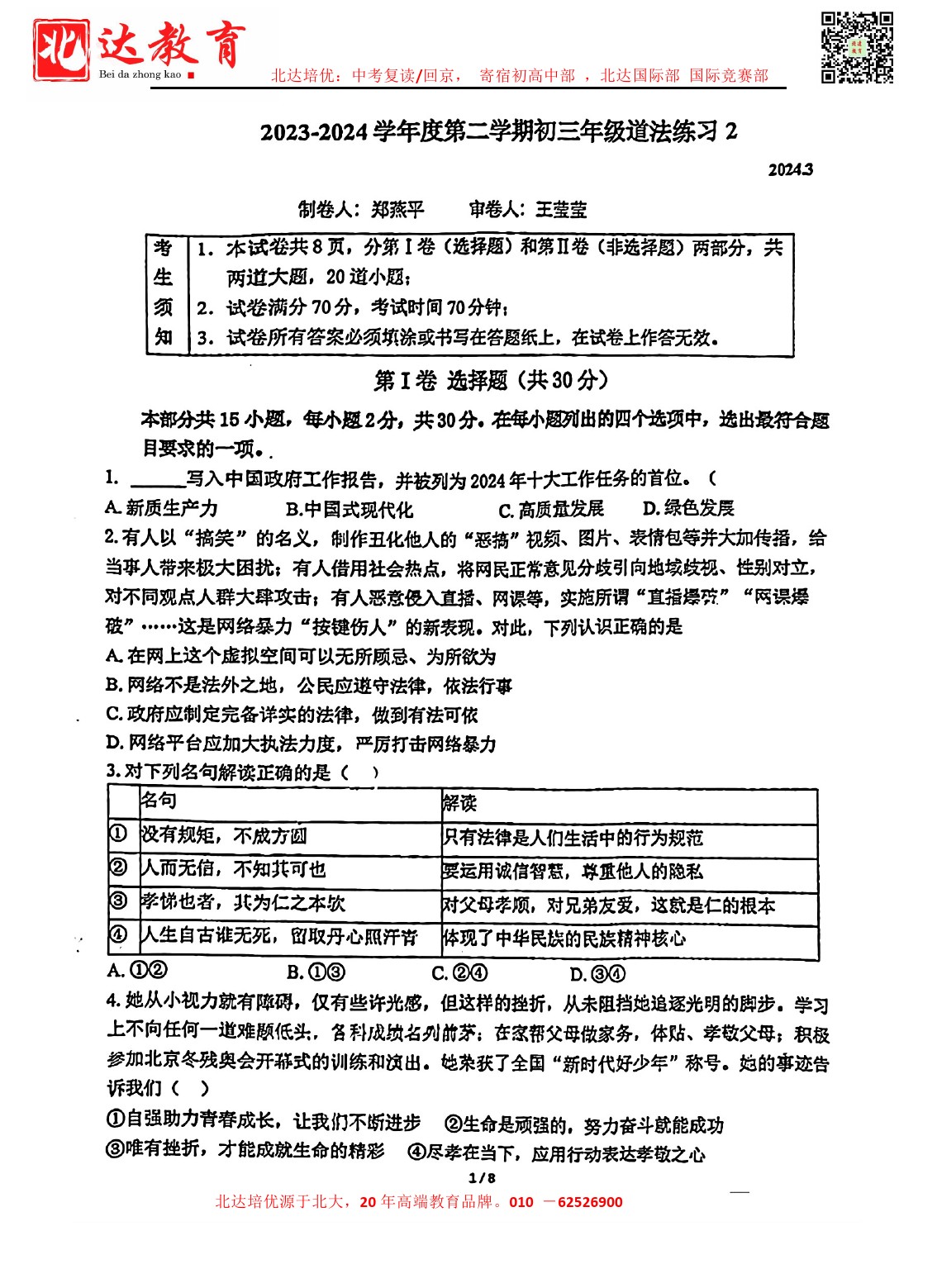 admw360中考网最新整理了2024北京人大附中初三( 下) 3月月考道法试题,需要的同学赶紧下载练习吧! 北京admw360全日制学校,中高考复读,外地回京中高考 电话咨询:400-6168182…