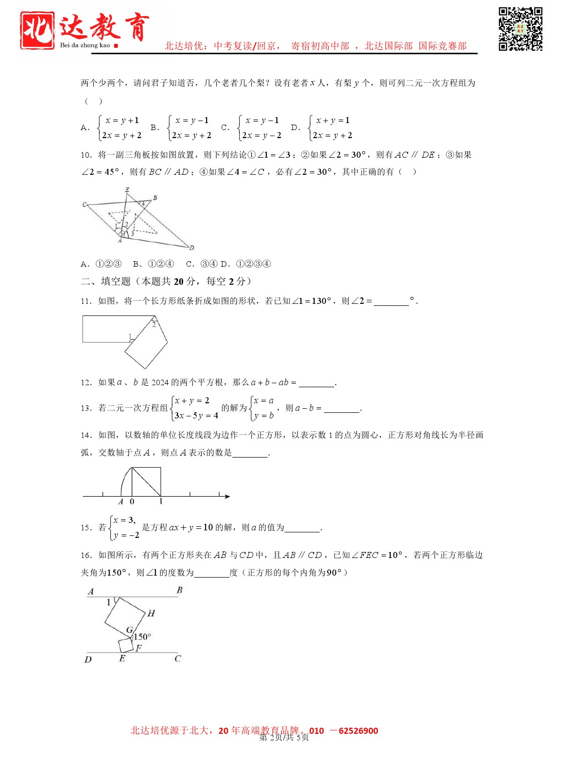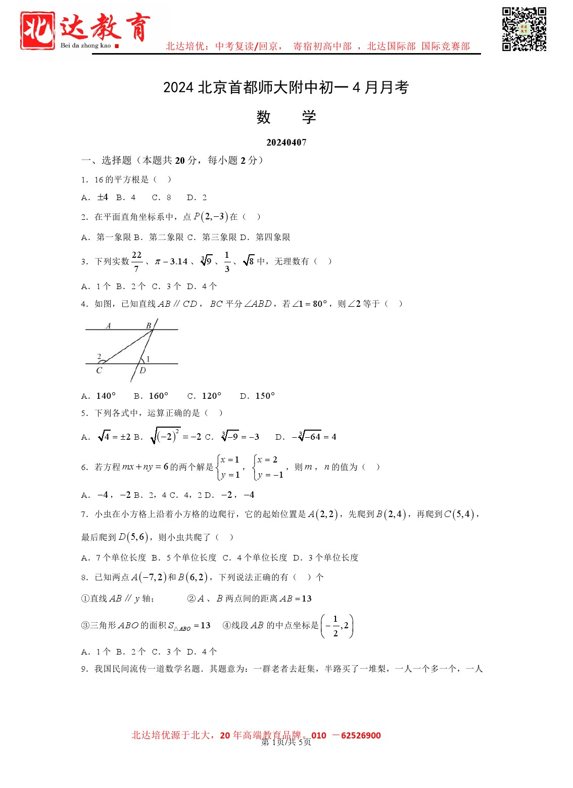 admw360教研组今日份整理了2024年北京首师大附中初一(下)4月月考数学试题,分享给大家。