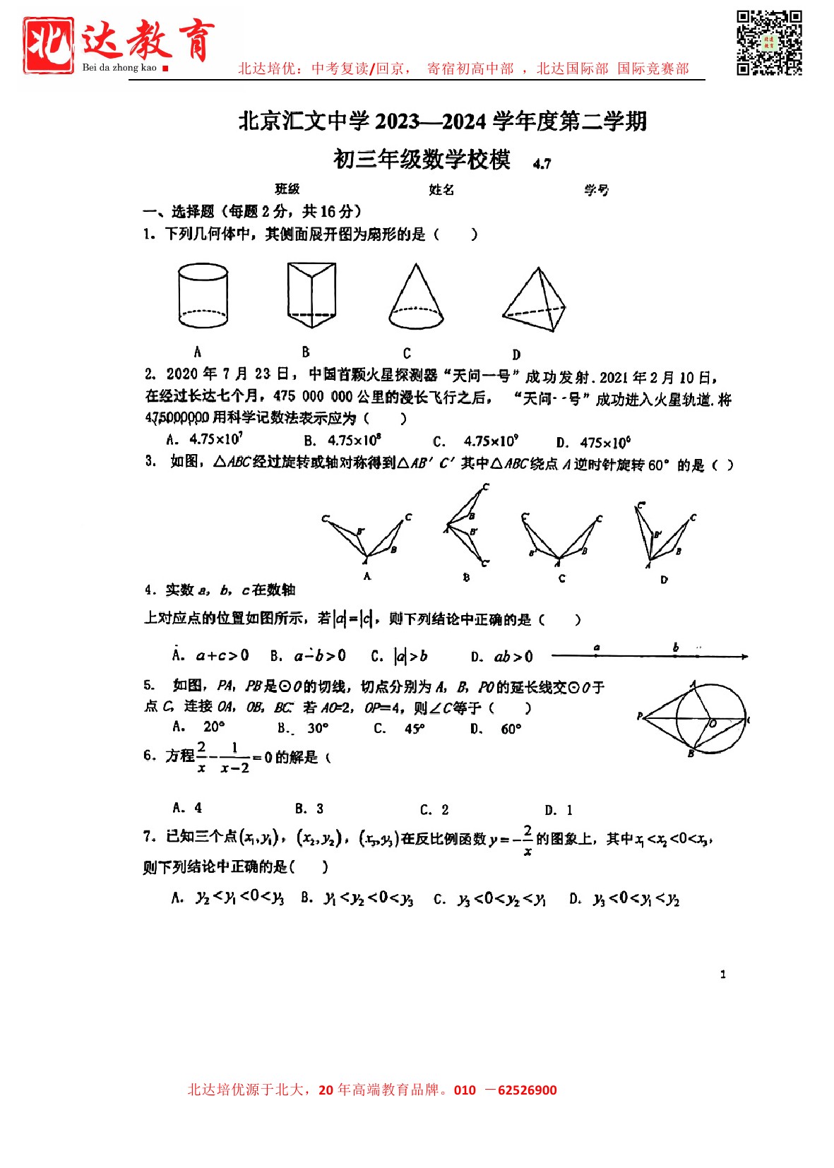 2024年北京汇文中学初三一模数学考试已结束,北京admw360教研组整理到了相关试卷资料,有需要的同学赶紧下载练习起来吧。