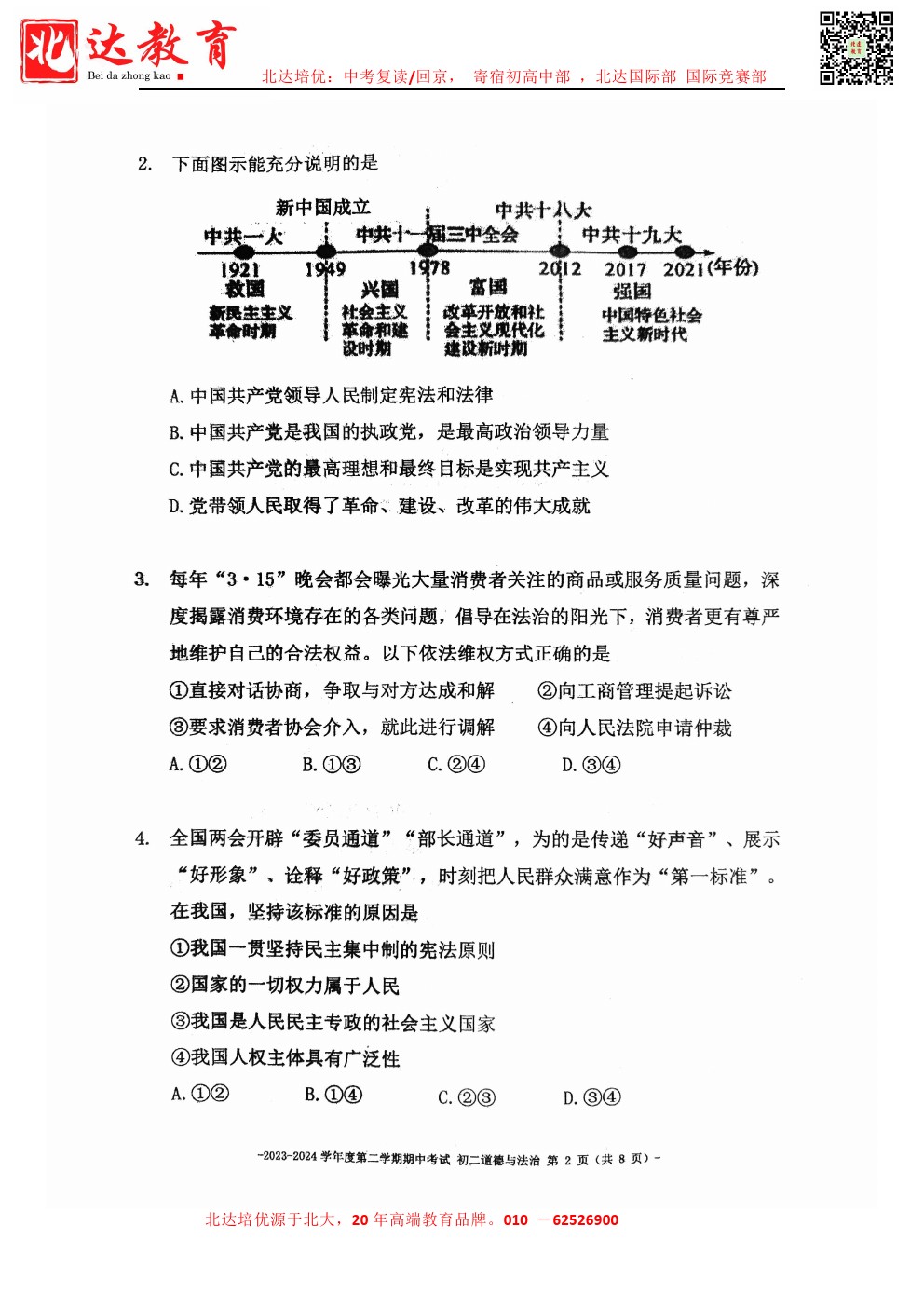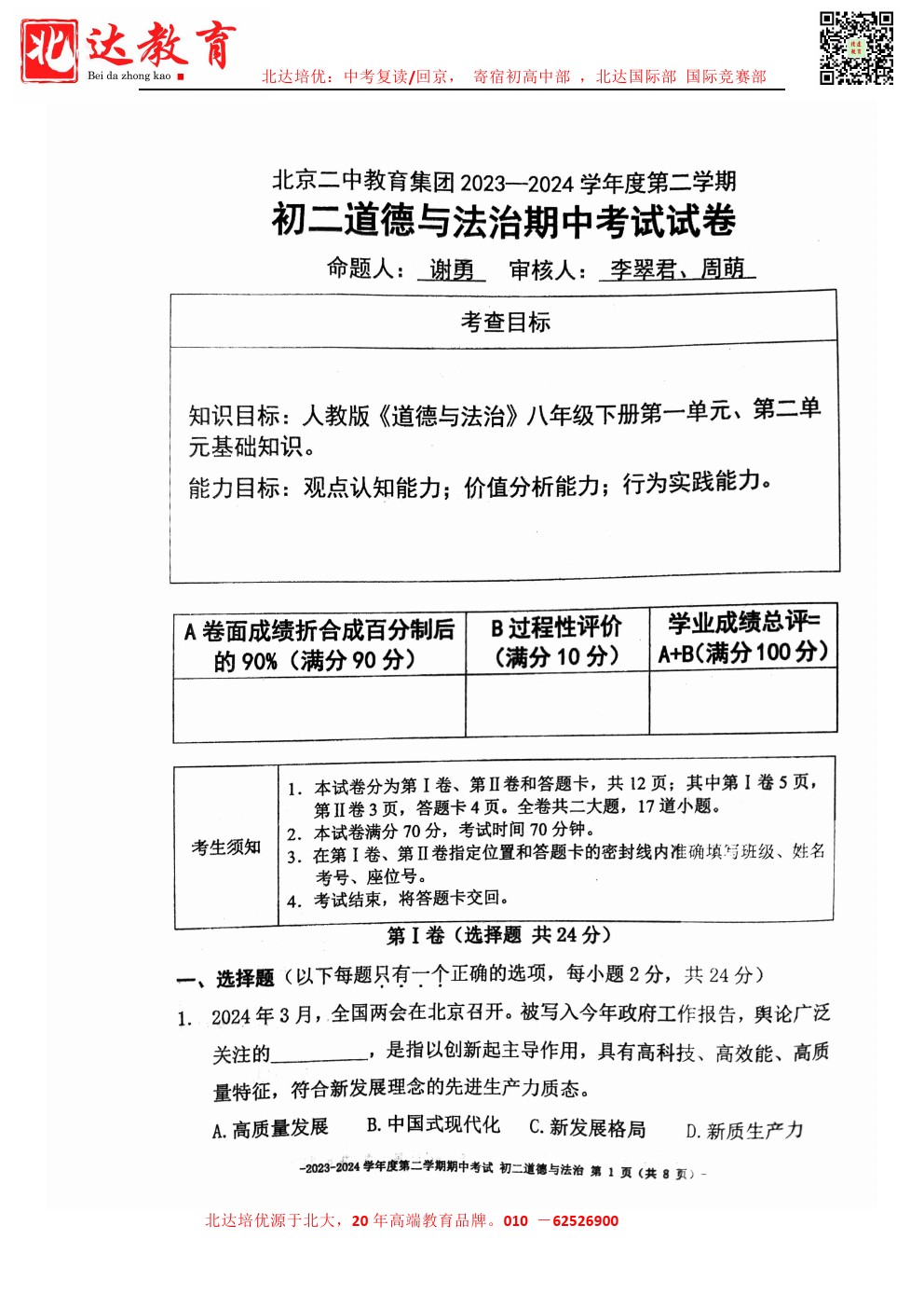admw360中考教研组最新整理了2024北京二中初二(下)期中道德与法治试题及答案,需要的同学赶紧下载练习吧! 北京admw360全日制学校,中高考复读,外地回京中高考 电话咨询:400-61681…