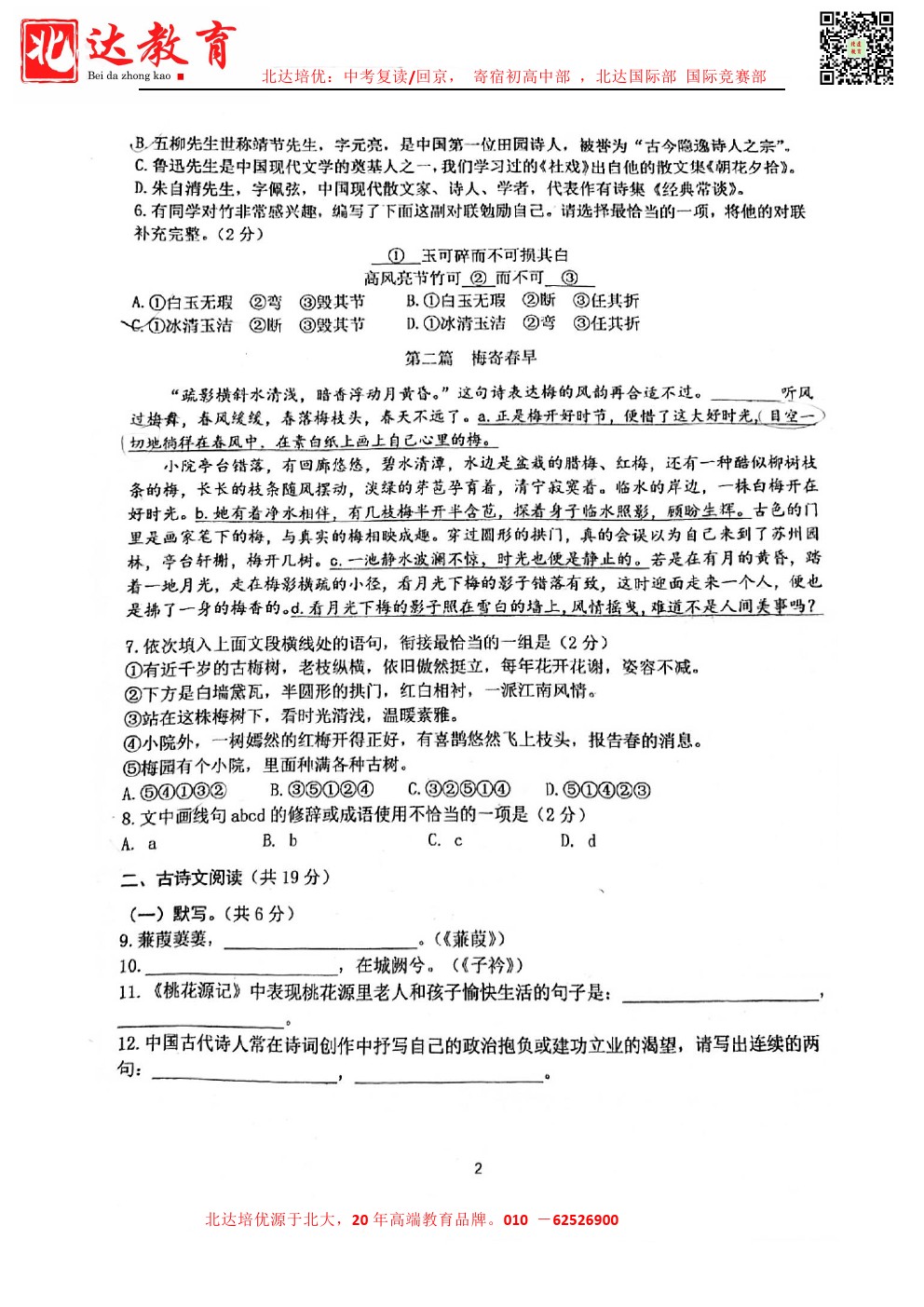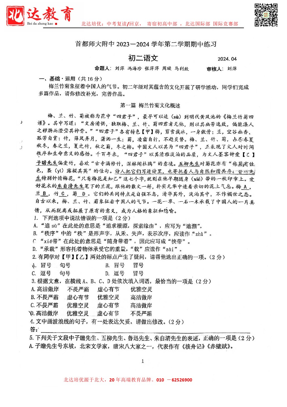 admw360中考教研组最新整理了2024北京首都师大附中初二(下)期中语文试题及答案,需要的同学赶紧下载练习吧! 北京admw360全日制学校,中高考复读,外地回京中高考 电话咨询:400-6168…