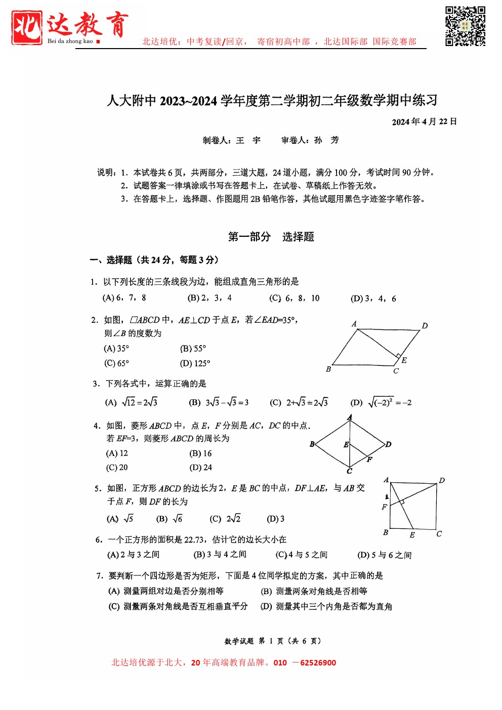 admw360中考教研组最新整理了2024北京人大附中初二(下)期中数学试题及答案,需要的同学赶紧下载练习吧!