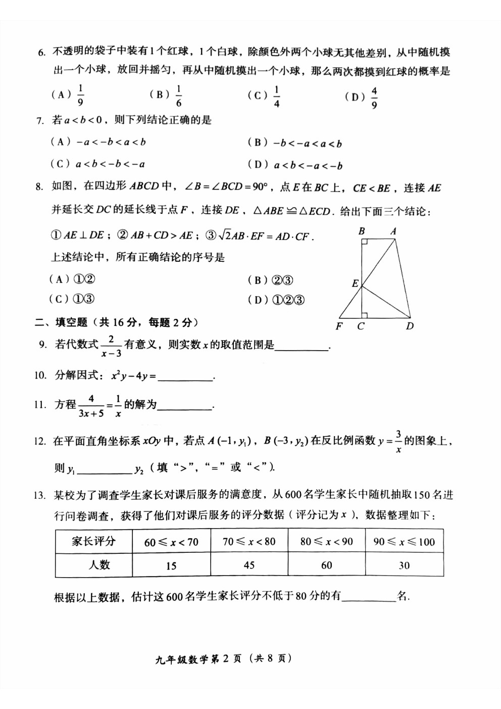 2024房山初三一模考数学试卷及答案