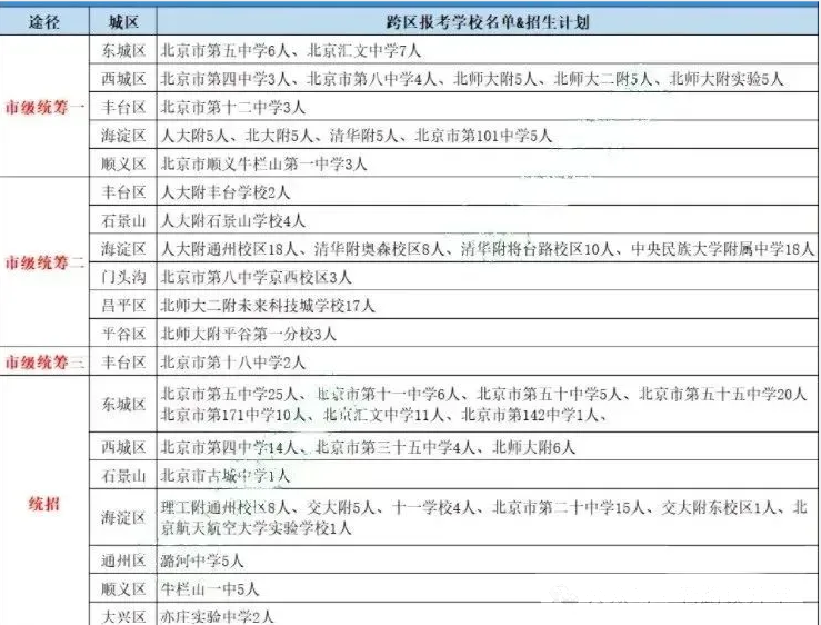 市级统筹属于校额到校的一种,一般参与市级统筹一的优质校除东西海以外(东西海是互锁的),在北京的其他区都会有招生计划,但是这个名额非常少,参与市级统筹的优质校在每个区县基本上也就给个位数名额,有的也就一两个名额。所以非常的难考,也就是各区里的前几名才可能有希望!