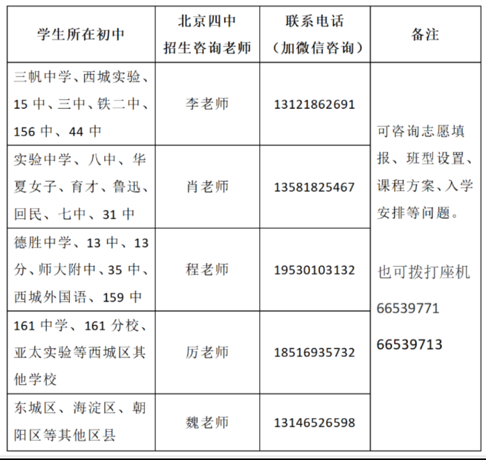 为满足广大考生和家长的需要,了解更多北京四中招生信息,特组织教师团队接受咨询。请根据学生初中校,添加北京四中老师的微信进行咨询。