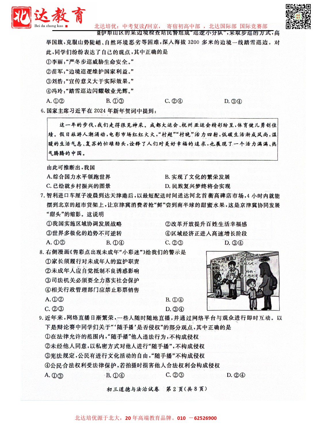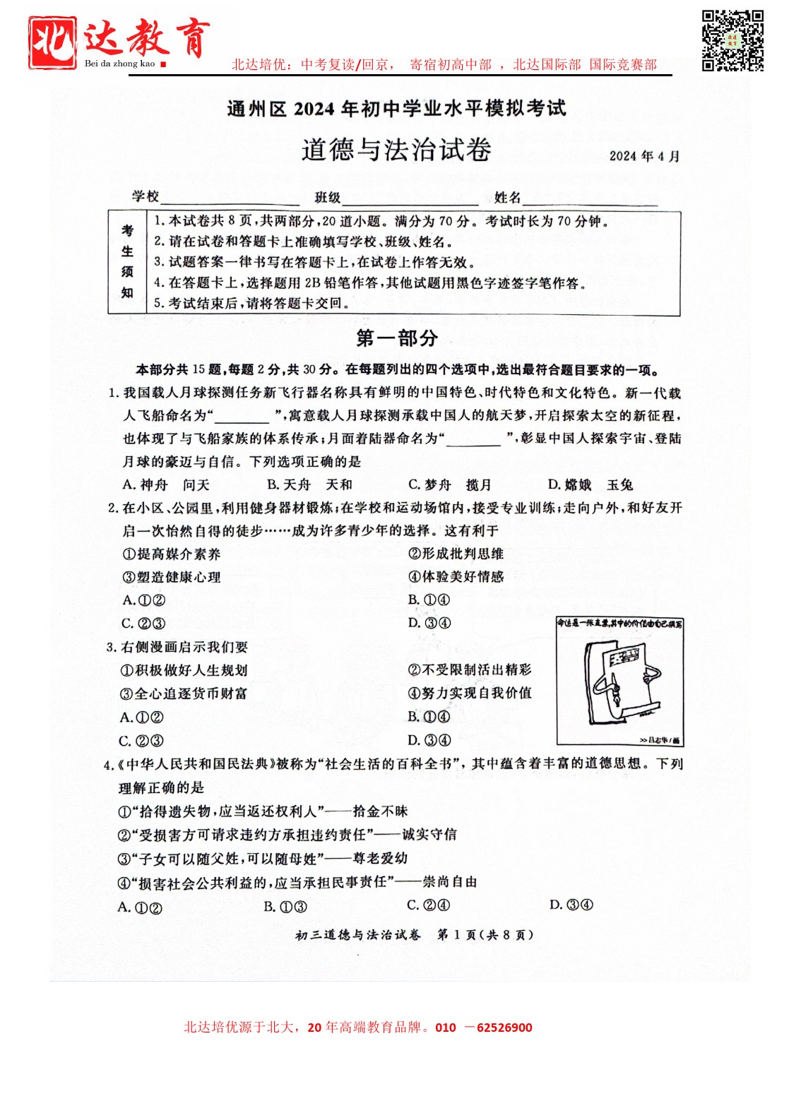 admw360中考教研组收集整理了2024北京通州区初三一模道法试题及答案,快来看看你答的如何吧。