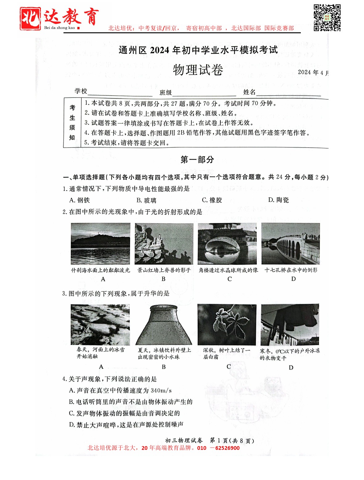 2024通州初三一模考物理试卷及答案