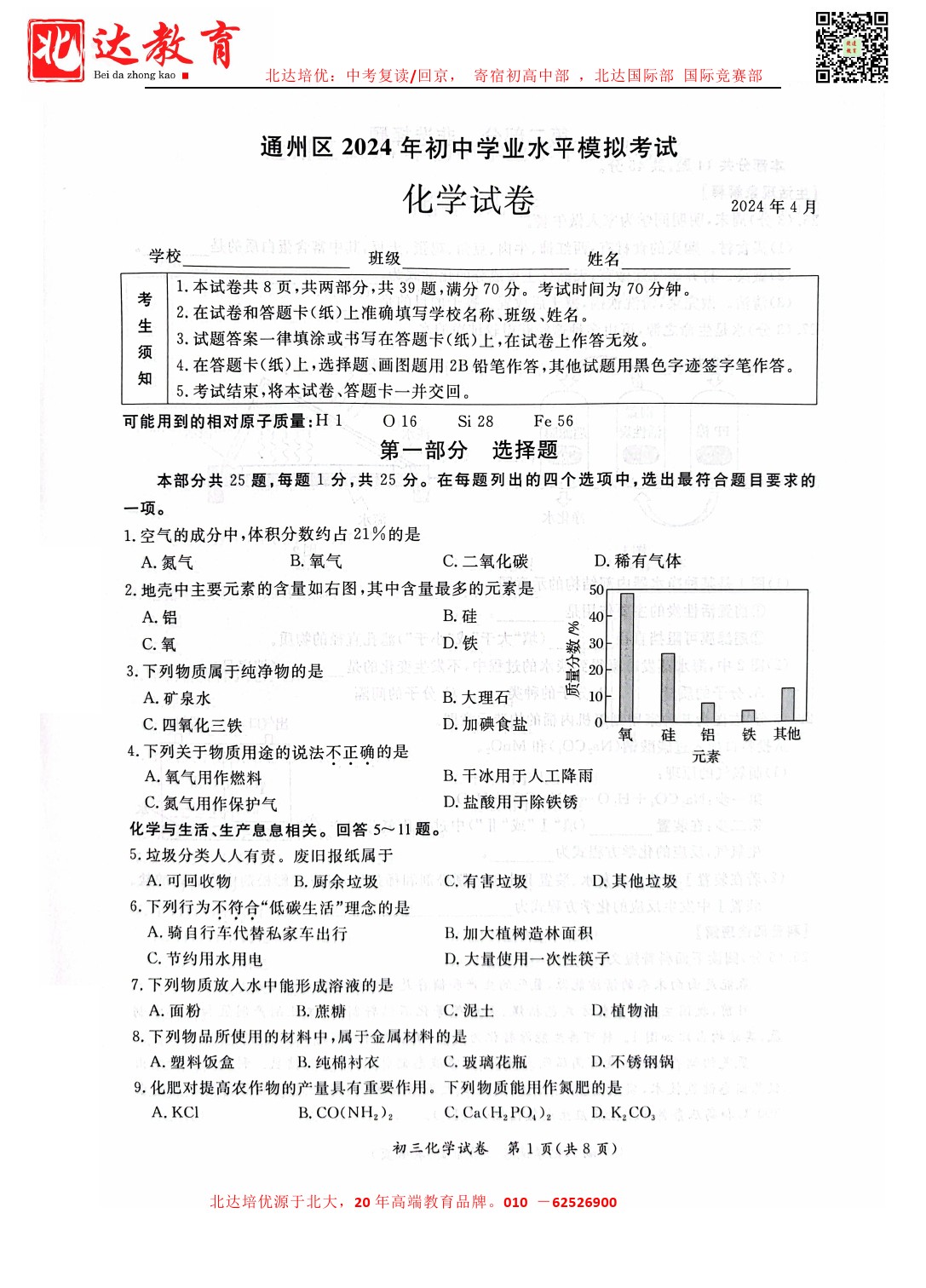 admw360中考教研组收集整理了2024北京通州区初三一模化学试题及答案,快来看看你答的如何吧。