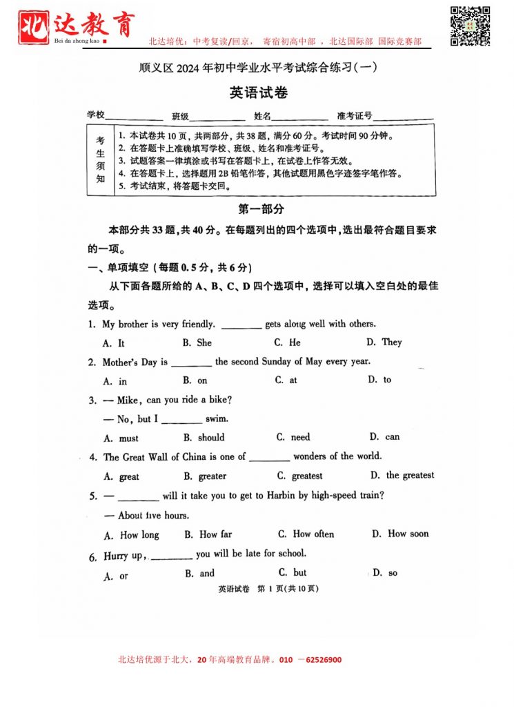 admw360中考教研组收集整理了北京顺义区2024初三一模考英语试卷及答案,快来看看你答的如何吧。