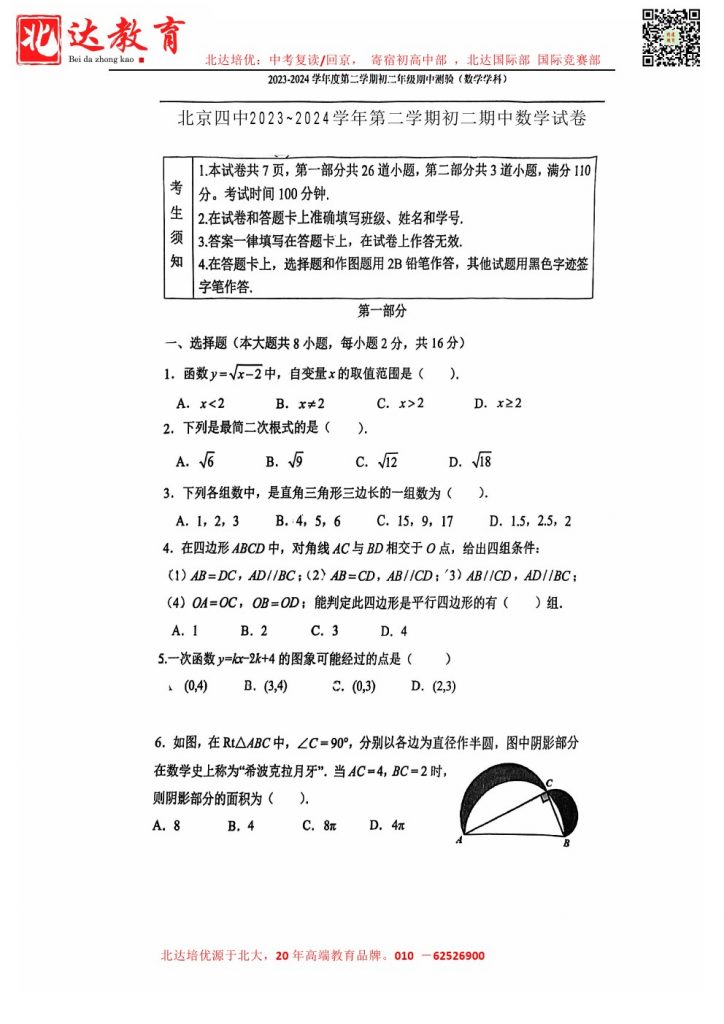 admw360中考教研组最新整理了2024北京四中初二(下)期中数学试题,需要的同学赶紧下载练习吧! 北京admw360全日制学校,中高考复读,外地回京中高考 电话咨询:400-6168182 010…