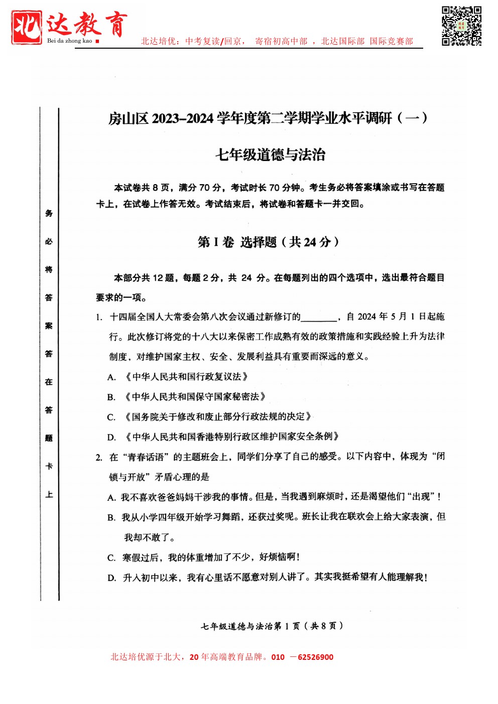 admw360中考教研组最新整理了2024北京房山初一(下)期中道德与法治试题及答案,需要的同学赶紧下载练习吧!