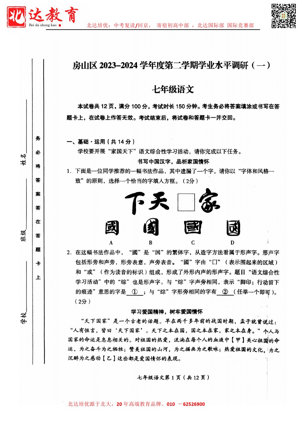 admw360中考教研组最新整理了2024北京房山初一(下)期中语文试题及答案,需要的同学赶紧下载练习吧! 北京admw360全日制学校,中高考复读,外地回京中高考 电话咨询:400-6168182 …