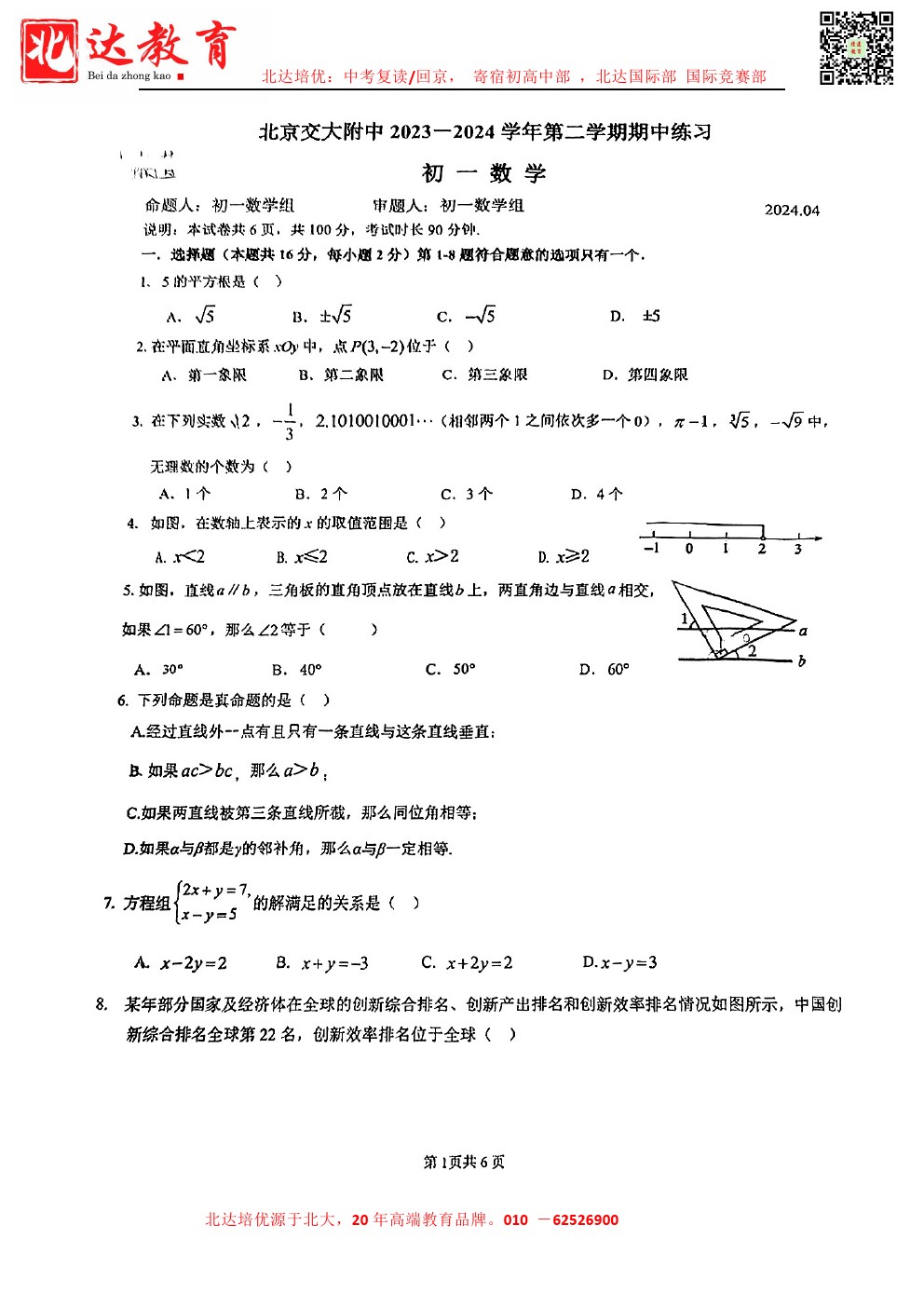 admw360中考教研组最新整理了2024 北京交大附初一(下)期中数学试题及答案,需要的同学赶紧下载练习吧! 北京admw360全日制学校,中高考复读,外地回京中高考 电话咨询:400-616818…