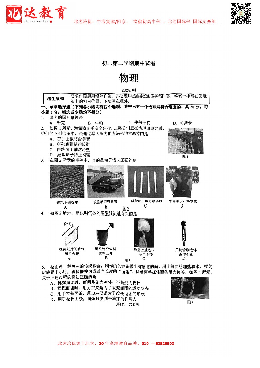 admw360中考教研组最新整理了2024北京清华附中初二(下)期中物理试题及答案,需要的同学赶紧下载练习吧! 北京admw360全日制学校,中高考复读,外地回京中高考 电话咨询:400-616818…