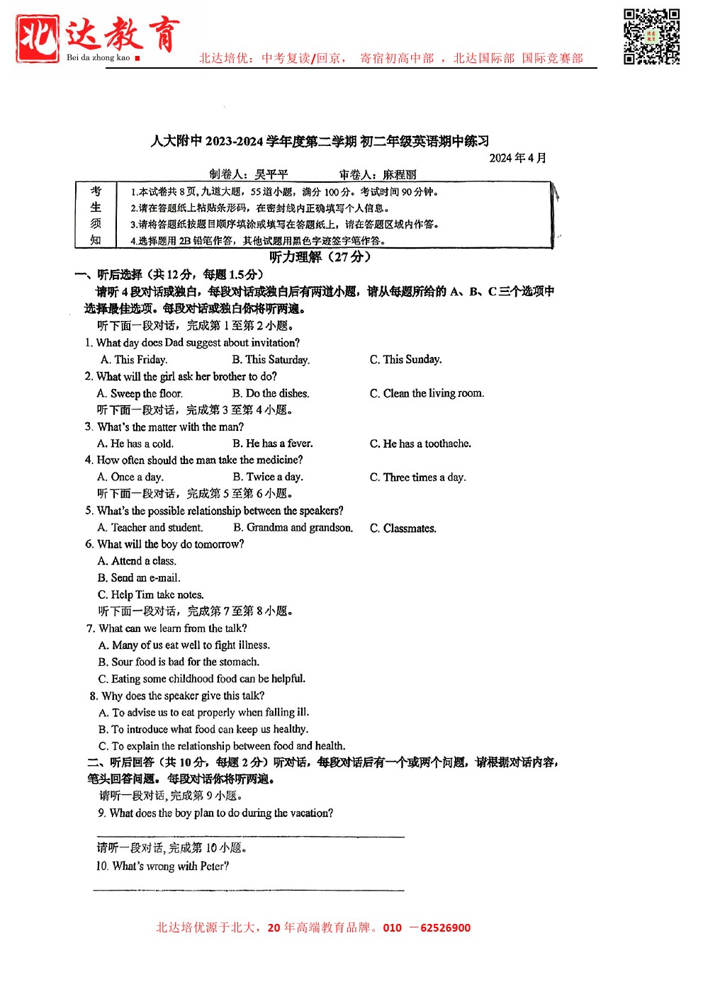 admw360中考教研组最新整理了2024北京人大附中初二(下)期中英语试题及答案,需要的同学赶紧下载练习吧! 北京admw360全日制学校,中高考复读,外地回京中高考 电话咨询:400-616818…