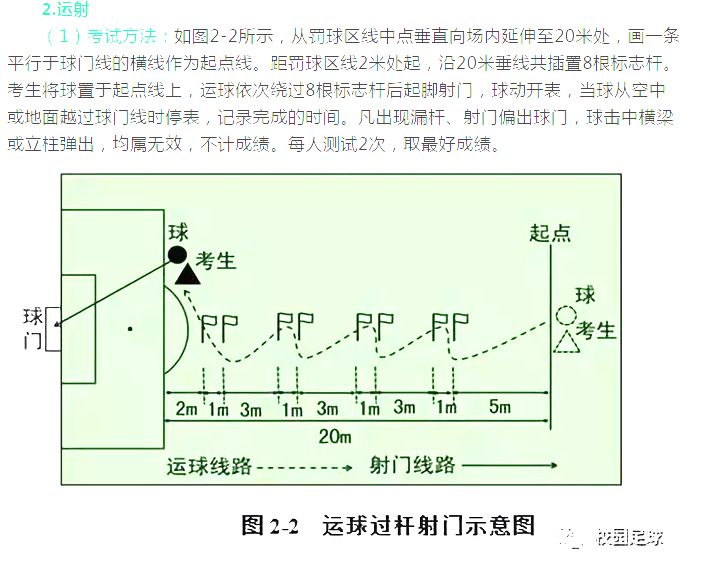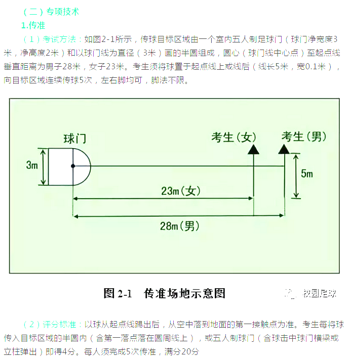 1.测试方法:在球场适当位置画一条15米线段作为测试区横宽,从横线两端分别向场内垂直画两条60米以上平行直线作为测试区纵长,标出距离数。考生站在起点线后,先将球以手掷远3次(允许带手套进行),然后用脚踢远3次(采用踢凌空球、反弹球、定位球等方法不限),各取其中最好一次成绩相加为最终成绩。每次掷、踢球的落点必须在测试区横宽以内,否则不计成绩