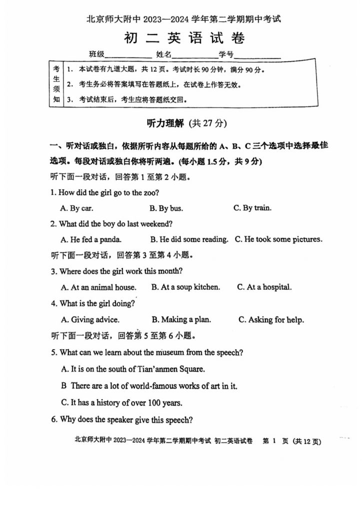 admw360中考教研组最新整理了2024北京北师大附中初二(下)期中英语试题,需要的同学赶紧下载练习吧!