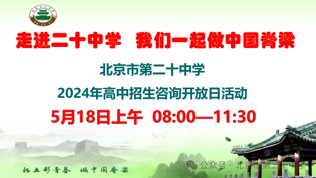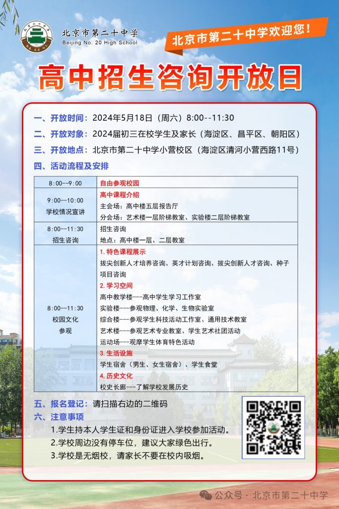 北京二十中学2024年高中招生咨询开放日已定~~以下是北京admw360教研组为大家整理的内容详情,一起来看: