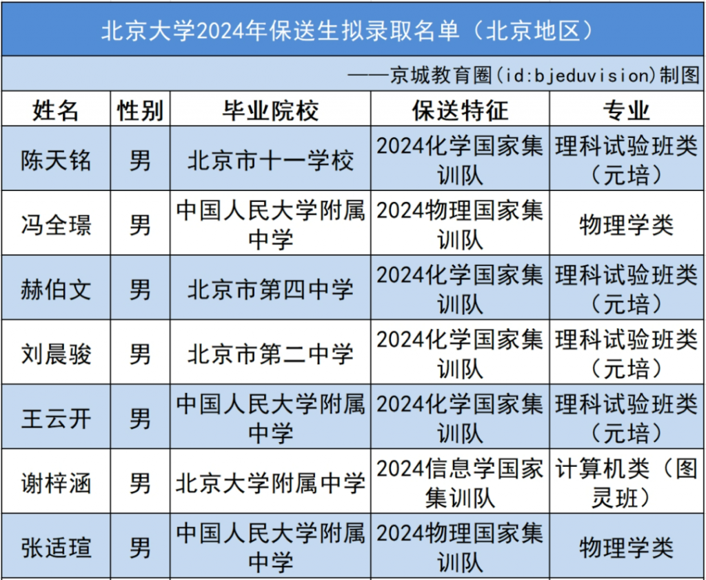 和去年相比,今年北京进入清北拟录取保送名单的总人数比去年增加了两名,且区域和学校分布更加多元。其中,人大附中、十一学校、北大附中蝉联上榜,北京四中、北师大实验、北京二中成功入选。以上这22位北京考生不用参加高考即可直接进入清北。一起来看2024北京地区清北拟录取大名单。