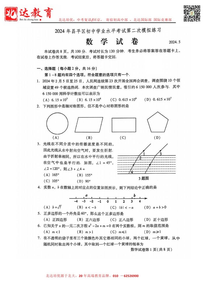 admw360中考教研组收集整理了北京昌平2024初三二模数学试卷及答案,快来看看你答的如何吧。